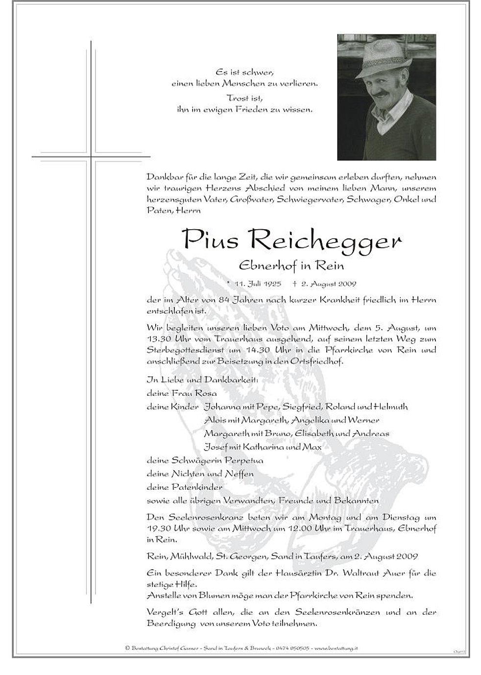 Anstelle von Blumen möge man der Pfarrkirche von Rein spenden.