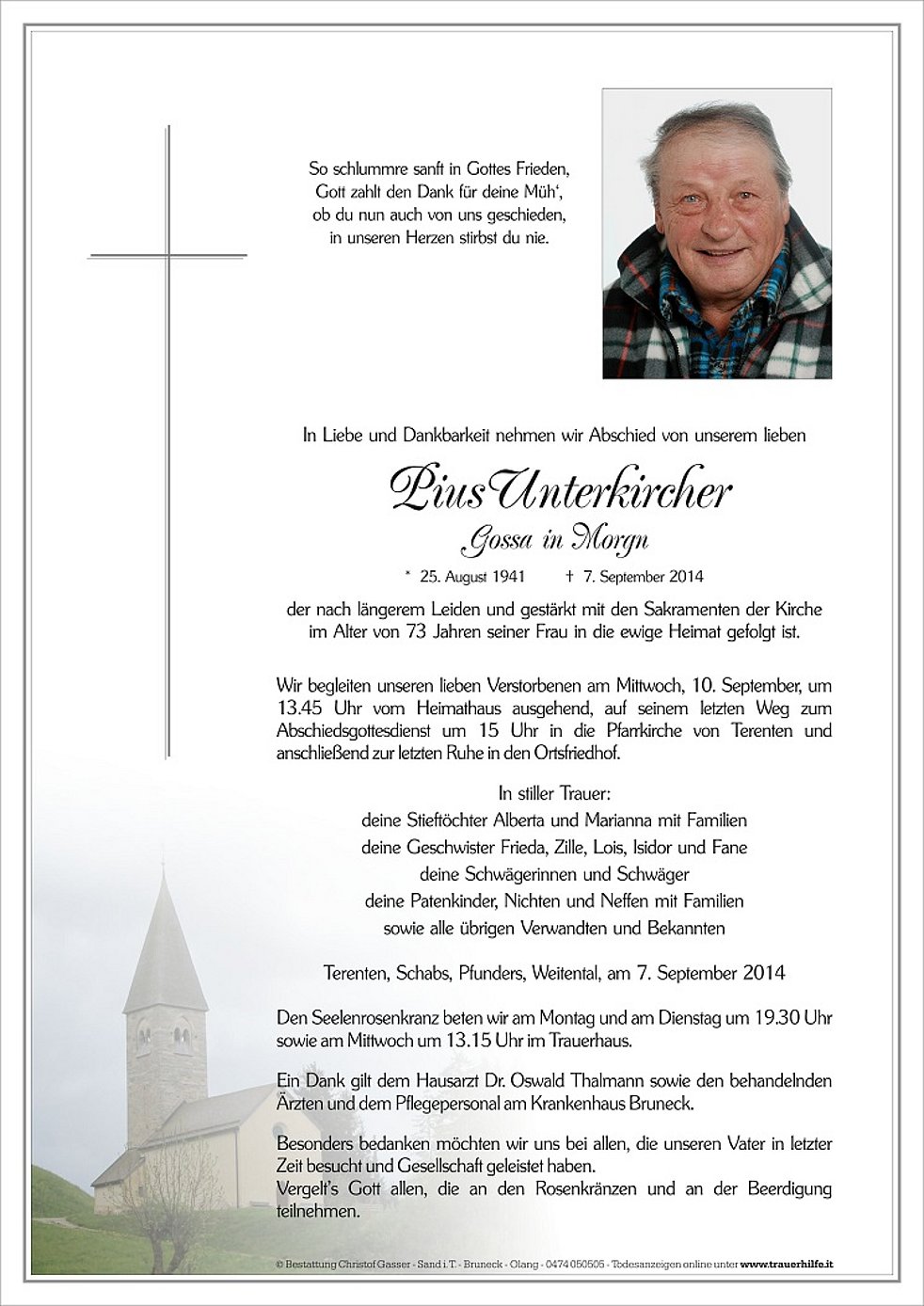 Wir begleiten unseren lieben Verstorbenen am Mittwoch, 10. September, um 13.45 Uhr vom Heimathaus ausgehend, auf seinem letzten Weg zum Abschiedsgottesdienst um 15 Uhr in die Pfarrkirche von Terenten und anschließend zur letzten Ruhe in den Ortsfriedhof.