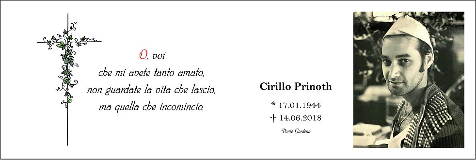 La Santa Messa in suffragio e la benedizione della salma avranno luogo sabato 16 giugno alle ore 14.30 nella Chiesa Parrocchiale di Ponte Gardena.