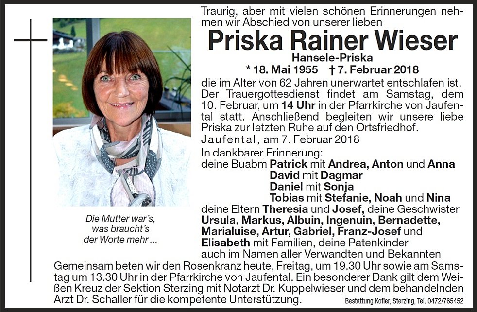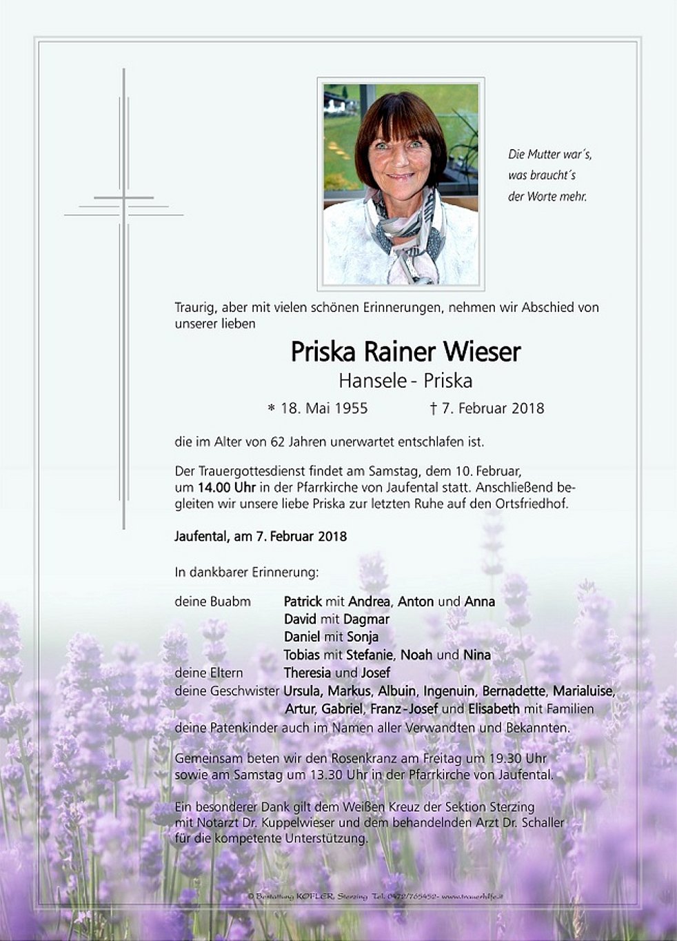 Der Trauergottesdienst findet am Samstag, dem 10. Februar, um 14.00 Uhr in der Pfarrkirche von Jaufental statt. Anschließend begleiten wir unsere liebe Priska zur letzten Ruhe auf den Ortsfriedhof.