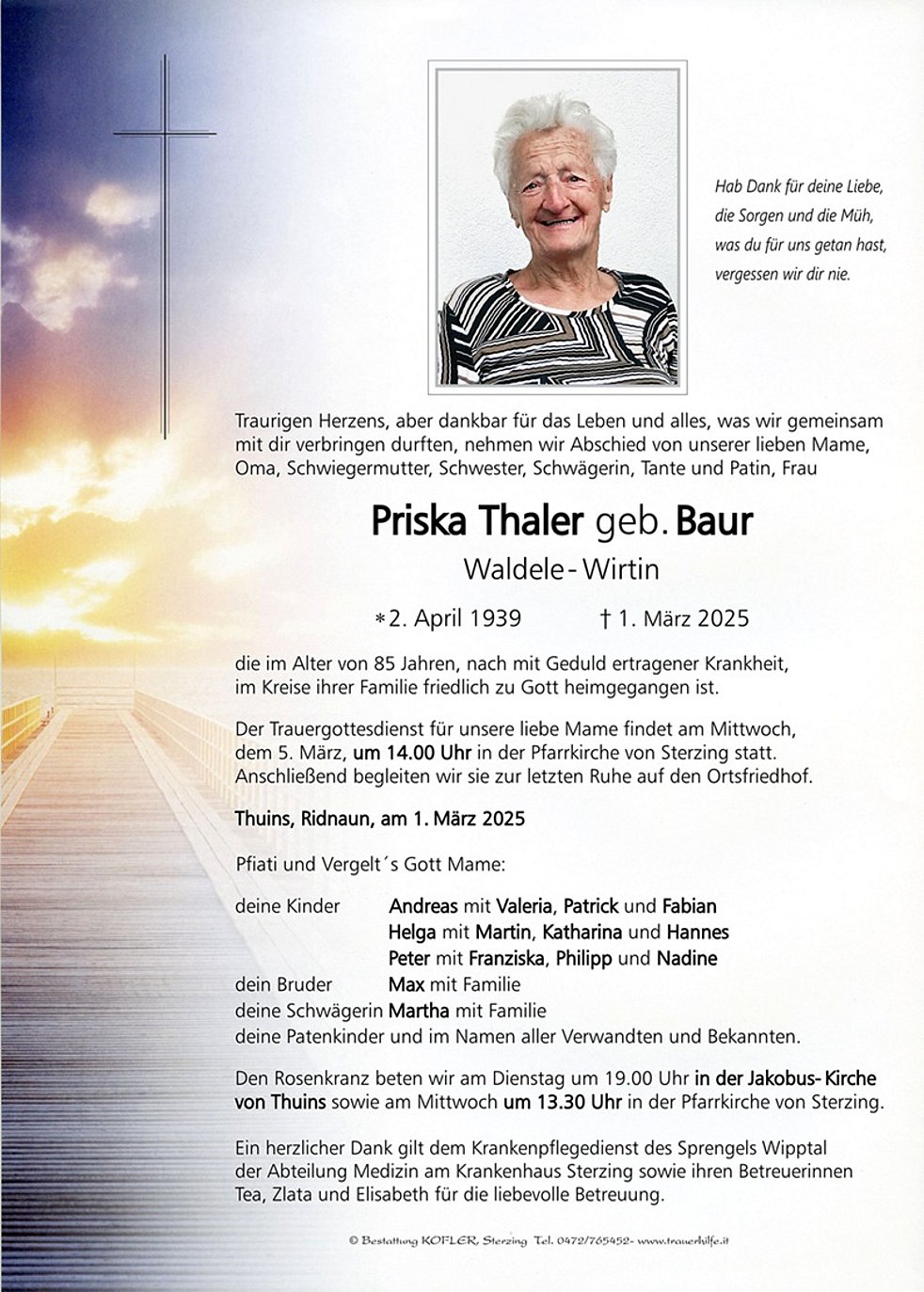 Der Trauergottesdienst für unsere liebe Mame findet am Mittwoch, dem 5. März, um 14.00 Uhr in der Pfarrkirche von Sterzing statt. Anschließend begleiten wir sie zur letzten Ruhe auf den Ortsfriedhof.