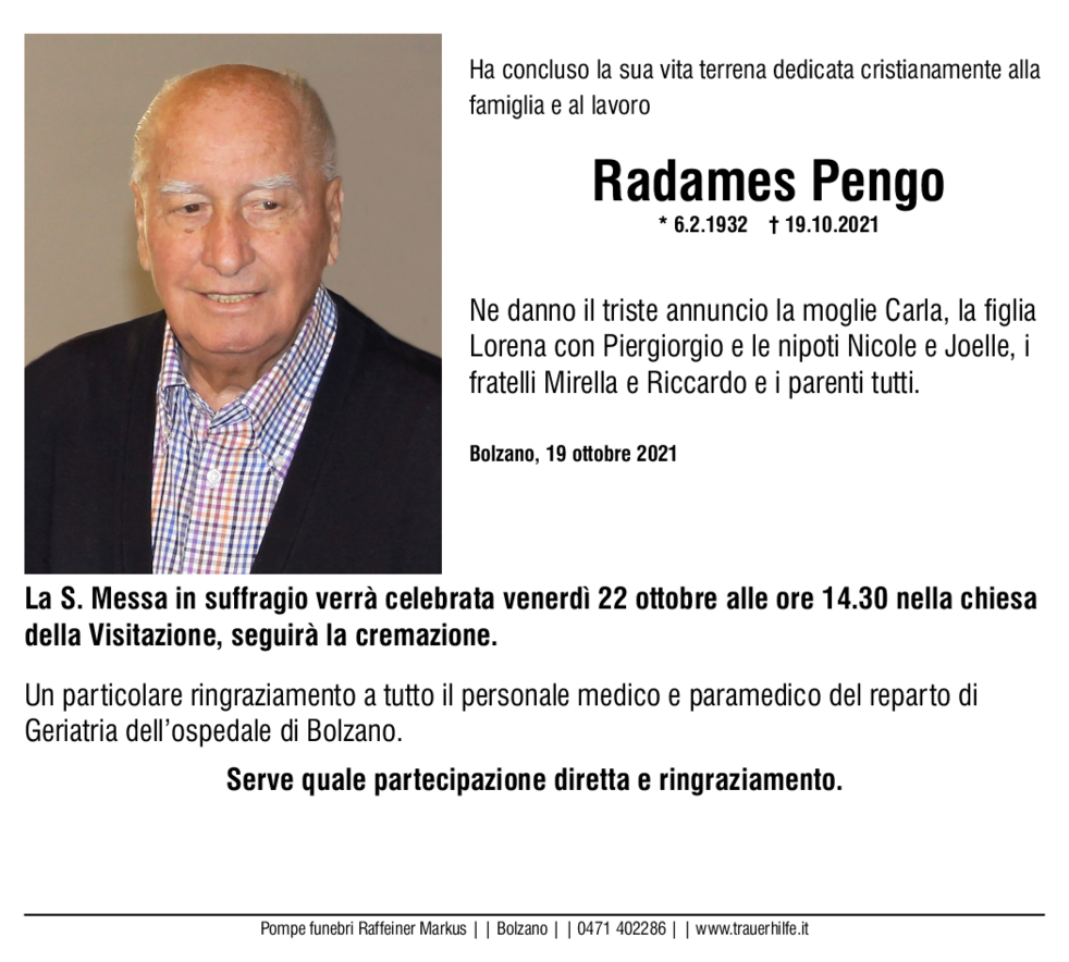 La S. Messa in suffragio verrà celebrata venerdì 22 ottobre alle ore 14.30 nella chiesa della Visitazione, seguirà la cremazione.