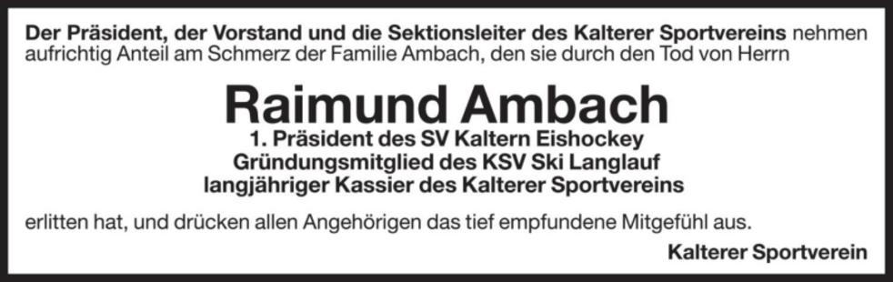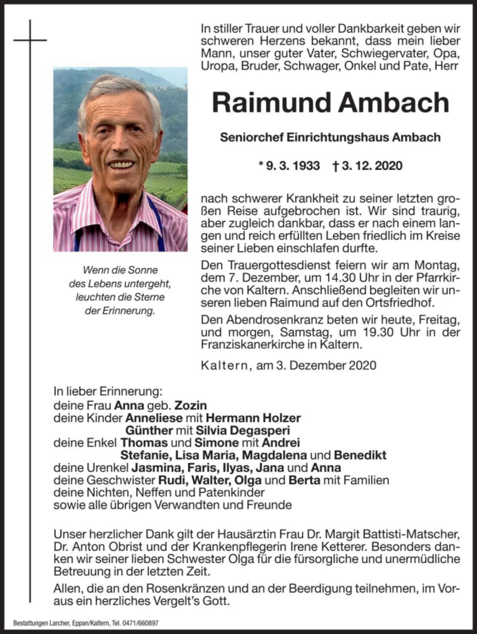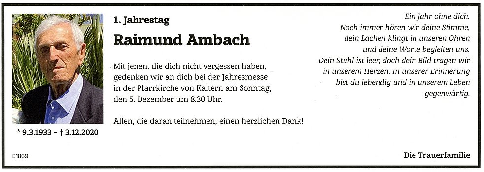 Den Trauergottesdienst feiern wir am Montag, dem 7. Dezember um 14.30 Uhr in der Pfarrkirche von Kaltern. Anschließend begleiten wir unseren lieben Raimund auf den Ortsfriedhof.
