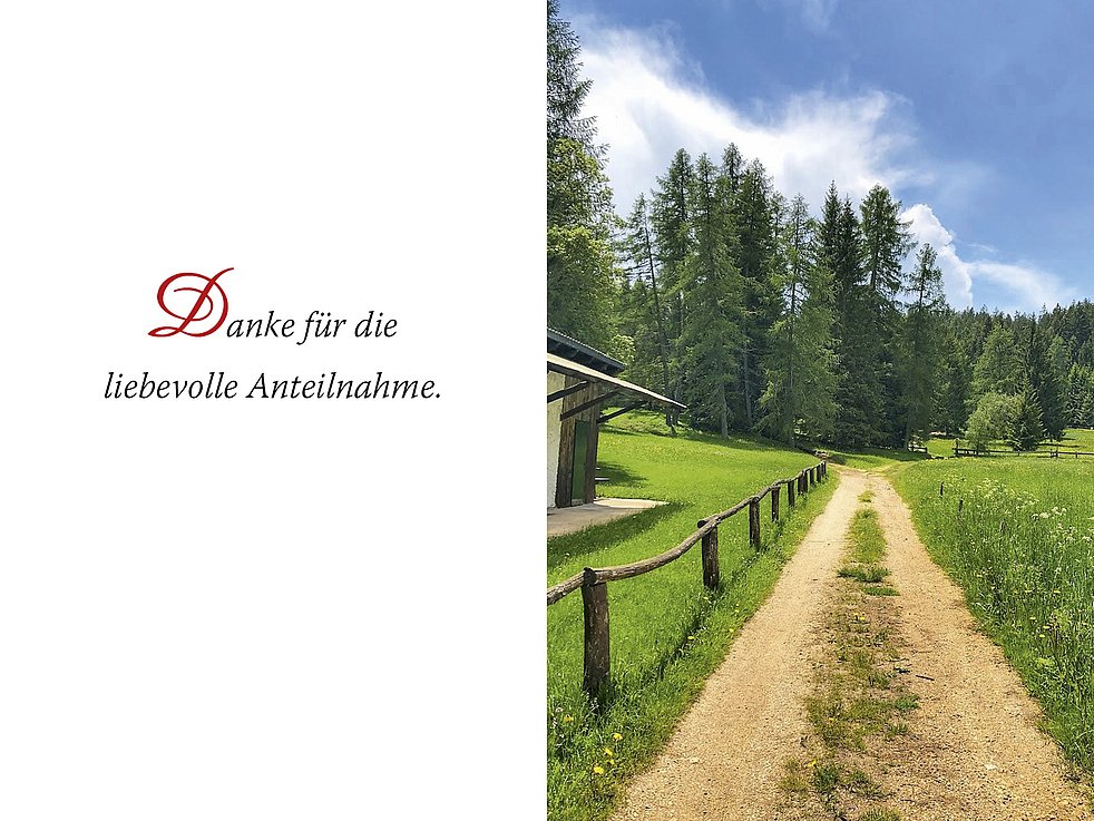 Unser herzlicher Dank gilt der Hausärztin Frau Dr. Margit Battisti-Matscher, Dr. Anton Obrist, und der Krankenpflegerin Irene Ketterer Besonders danken wir seiner lieben Schwester Olga für die fürsorgliche und unermüdliche Betreuung in der letzten Zeit.
