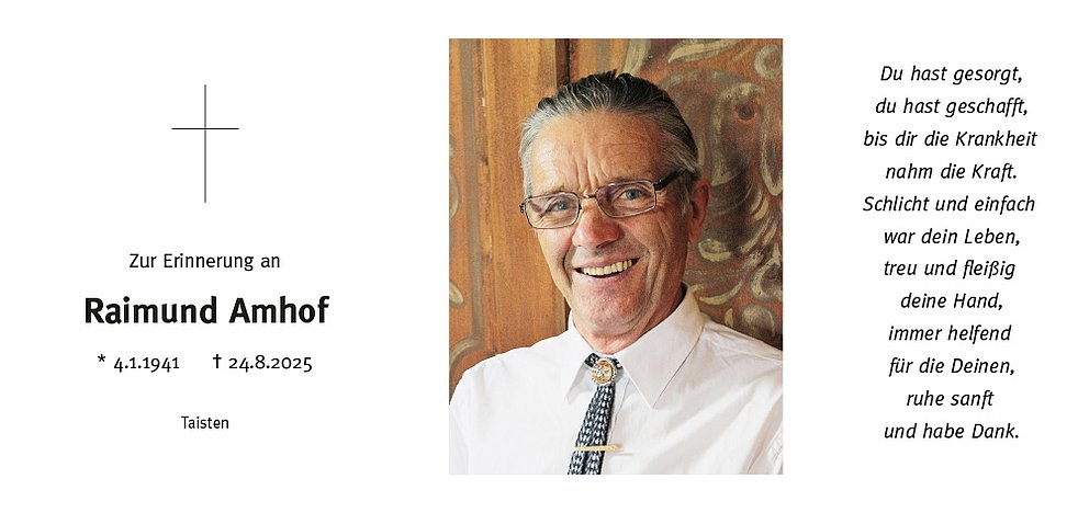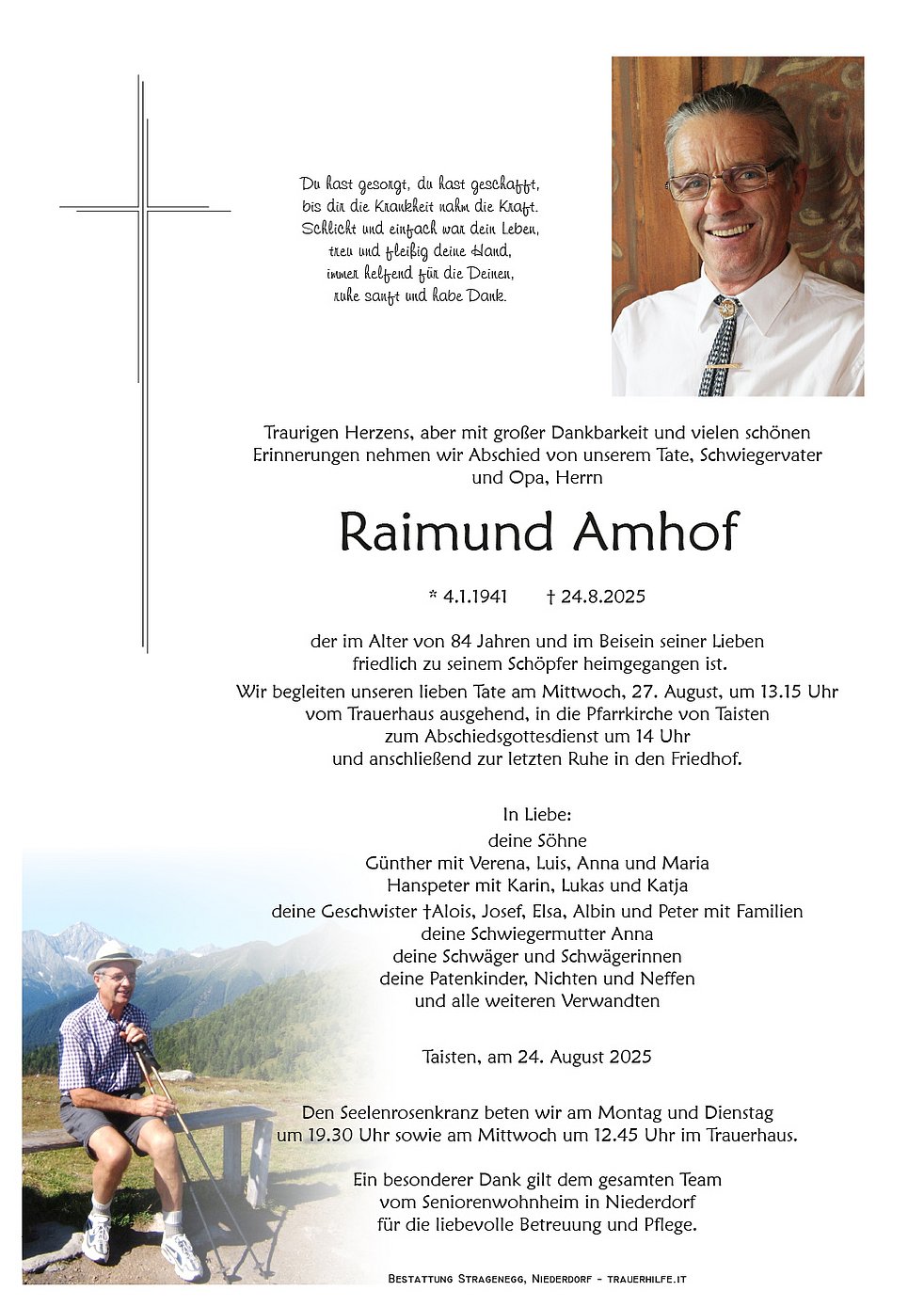 Begräbnisgottesdienst: 27.08. - 14:00 Uhr Taisten