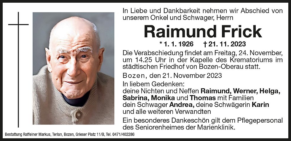 Die Verabschiedung findet am Freitag, 24. November, um 14.25 Uhr in der Kapelle des Krematoriums im städtischen Friedhof von Bozen Oberau statt.