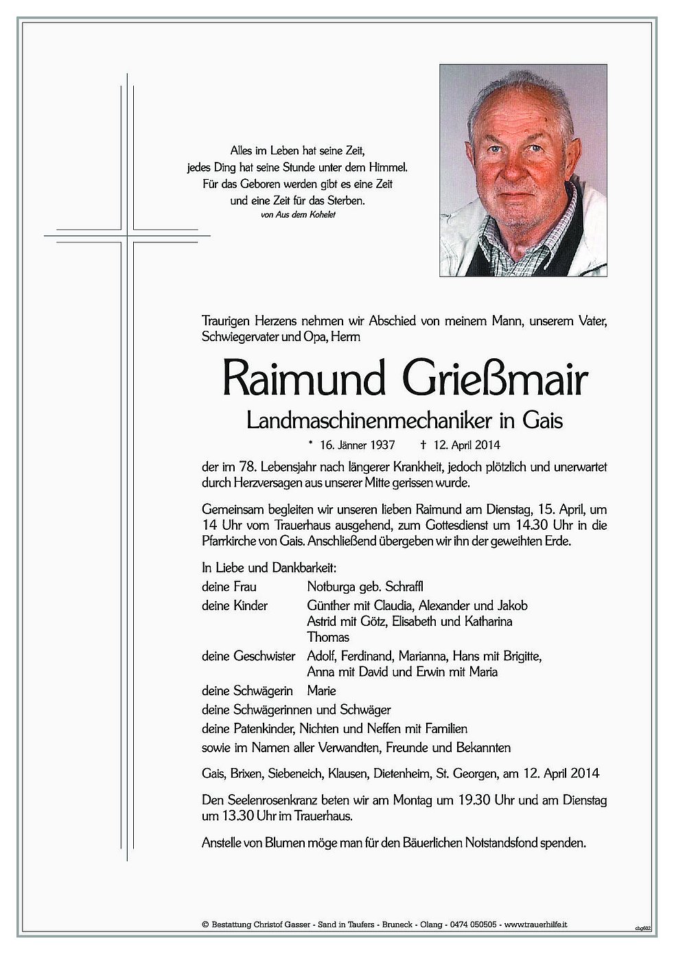 Gemeinsam begleiten wir unseren lieben Raimund am Dienstag, 15. April, um 14 Uhr vom Trauerhaus ausgehend, zum Gottesdienst um 14.30 Uhr in die Pfarrkirche von Gais. Anschließend übergeben wir ihn der geweihten Erde.