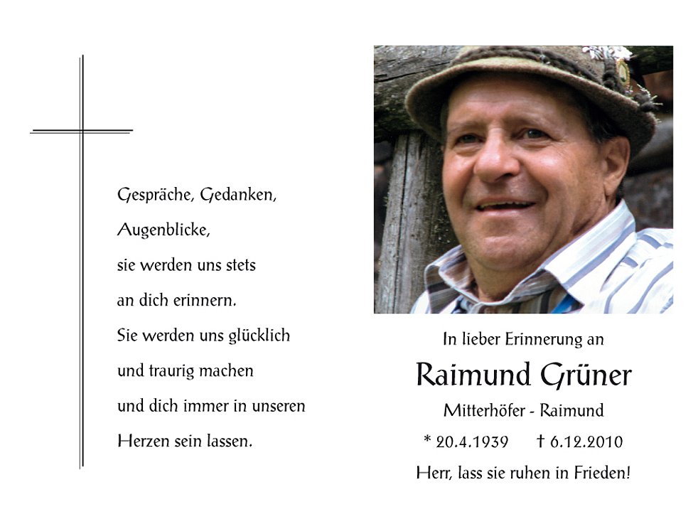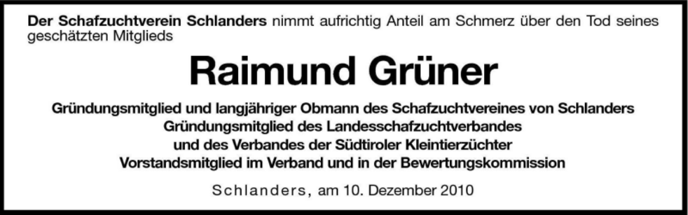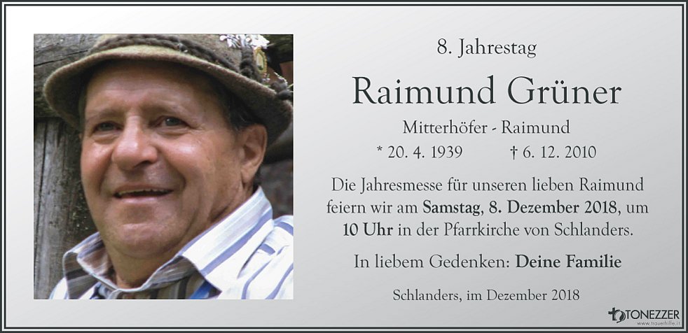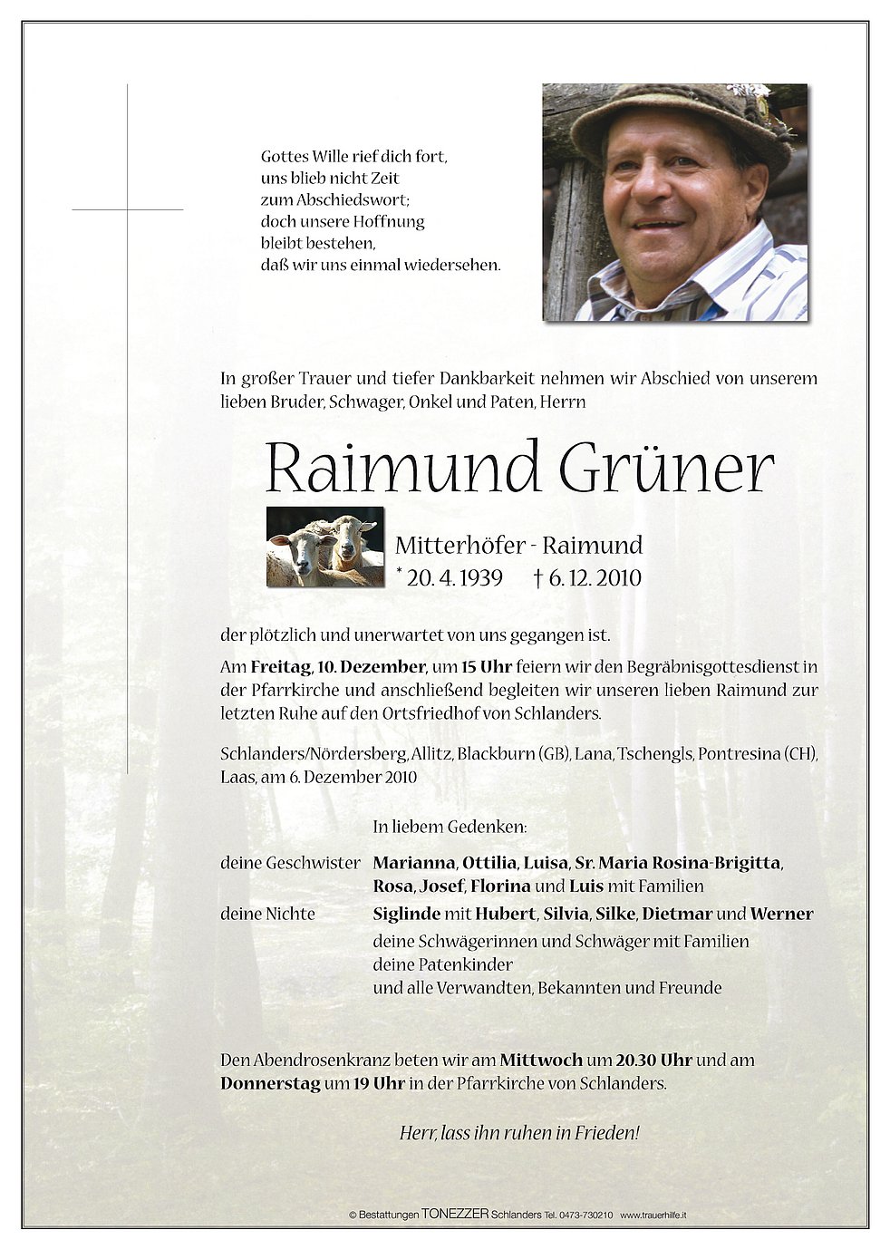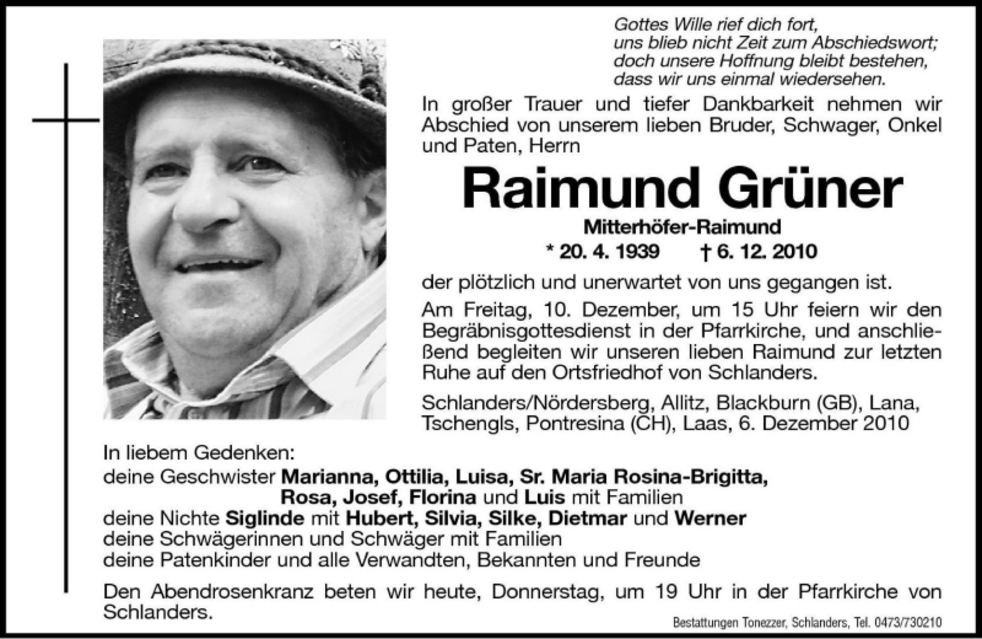 Am Freitag, 10. Dezember, um 15 Uhr feiern wir den Begräbnisgottesdienst in der Pfarrkirche und anschließend begleiten wir unseren lieben Raimund zur letzten Ruhe auf den Ortsfriedhof von Schlanders.