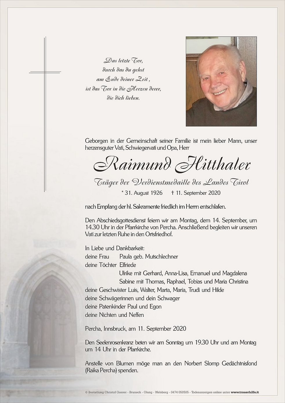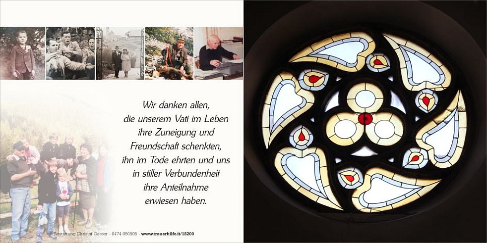 Den Abschiedsgottesdienst feiern wir am Montag, dem 14. September, um 14.30 Uhr in der Pfarrkirche von Percha. Anschließend begleiten wir unseren Vati zur letzten Ruhe in den Ortsfriedhof.