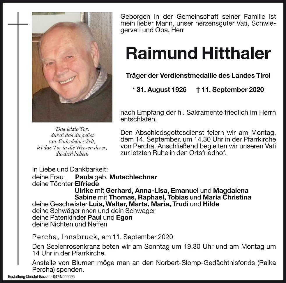 Anstelle von Blumen möge man an den Norbert Slomp Gedächtnisfond (Raika Percha) spenden.