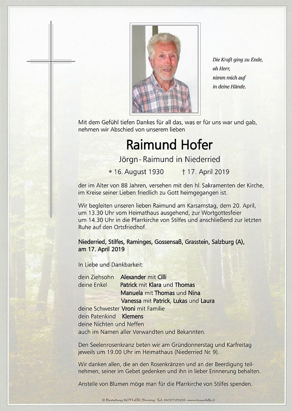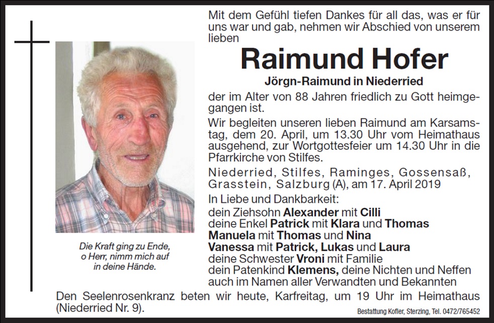 Wir begleiten unseren lieben Raimund am Karsamstag, dem 20. April, um 13.30 Uhr vom Heimathaus ausgehend, zur Wortgottesfeier um 14.30 Uhr in die Pfarrkirche von Stilfes und anschließend zur letzten Ruhe auf den Ortsfriedhof.