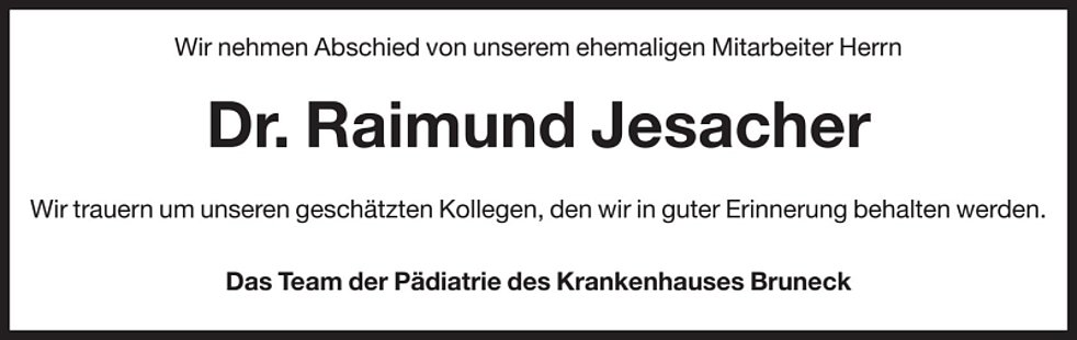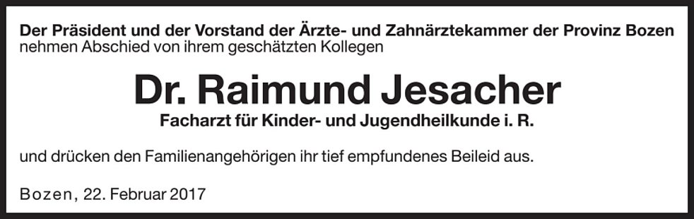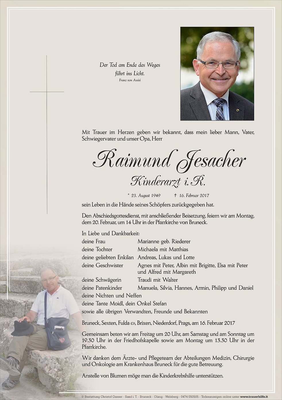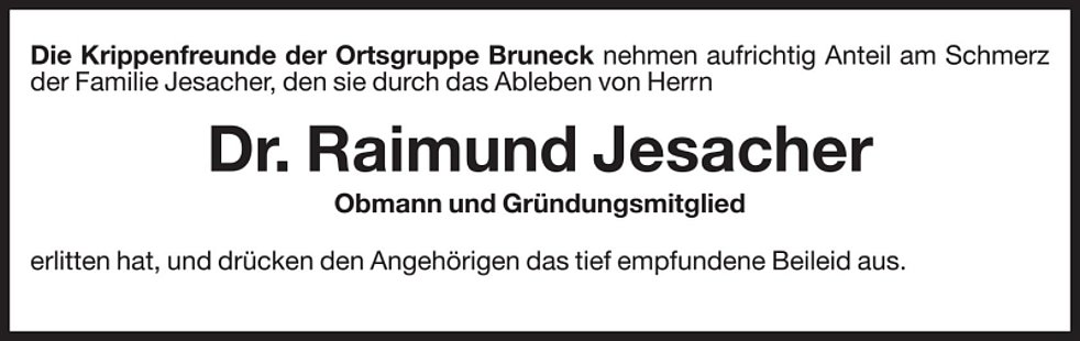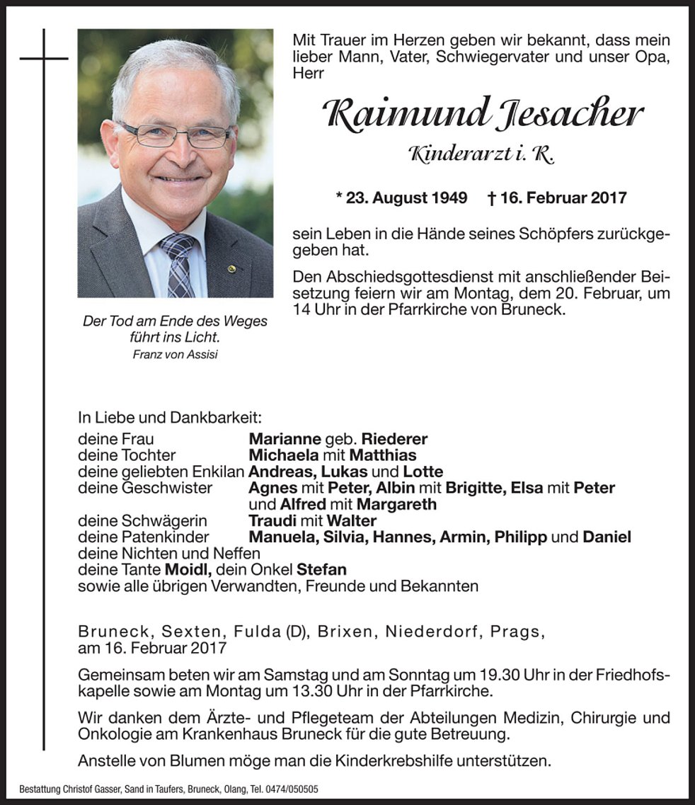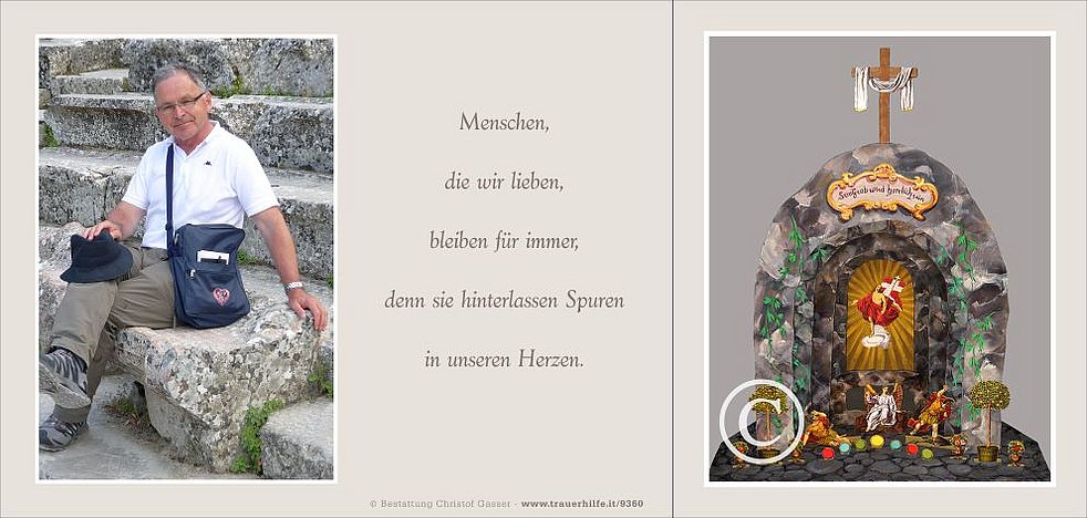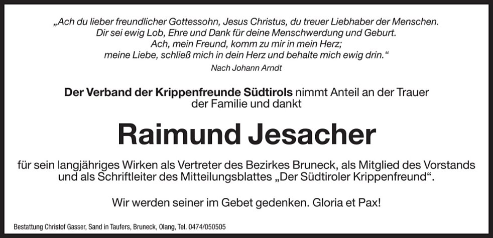 Den Abschiedsgottesdienst, mit anschließender Beisetzung, feiern wir am Montag, dem 20. Februar, um 14 Uhr in der Pfarrkirche von Bruneck.
