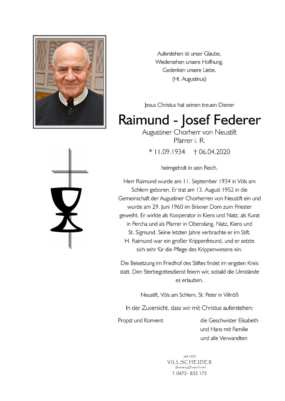 Pfarrer Raimund Federer, Sie waren Ihr ganzes Priesterleben lang vom Glauben und Wissen getragen, wie Jesus Christus ins Himmelreich eingehen zu dürfen. Der Herr möge Sie nun auf ewig das österliche Licht der Auferstehung schauen und spüren lassen. Mögen Sie ruhen in Frieden. Wenn die Zeit auf Erden endet, beginnt die Ewigkeit bei Gott.