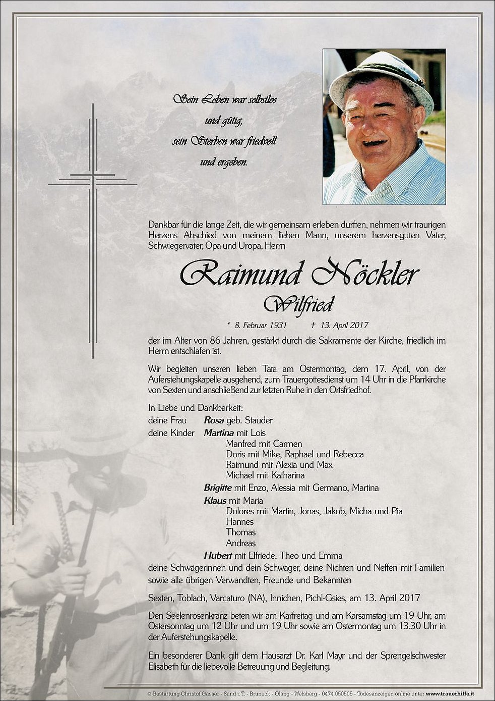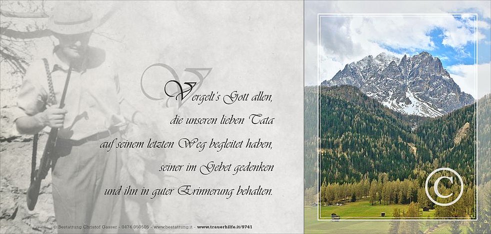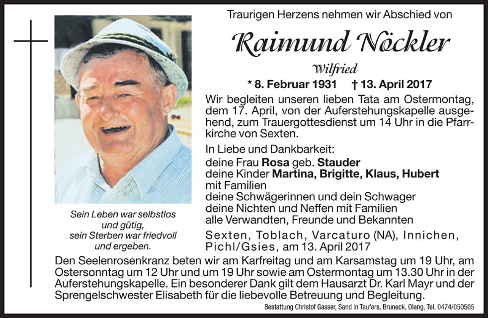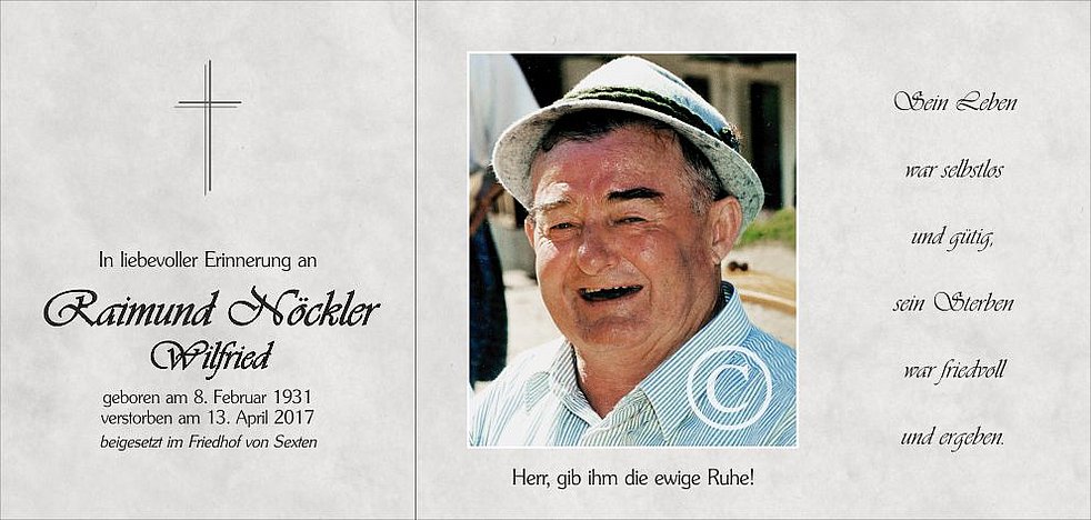 Wir begleiten unseren lieben Tata am Ostermontag, dem 17. April, von der Auferstehungskapelle ausgehend, zum Trauergottesdienst um 14 Uhr in die Pfarrkirche von Sexten und anschließend zur letzten Ruhe in den Ortsfriedhof.