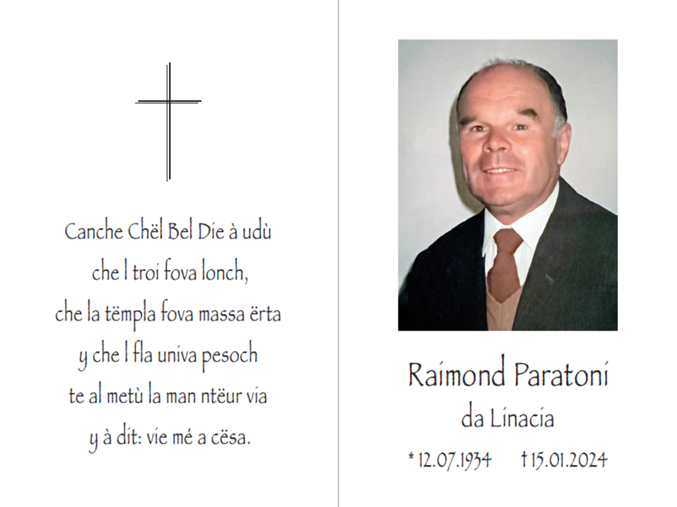 Ein besonderer Dank gilt dem Pflegepersonal vom 2. Stock des Altersheims San Durich, den behandelnden Ärzten Dr. Cordula Weber und Dr. Simon Kostner, den Nachbarn Albert und Clara sowie allen, die am Rosenkranz und an der Beerdigung teilnehmen.