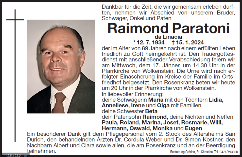 Den Trauergottesdienst mit anschließender Verabschiedung feiern wir am Mittwoch, dem 17. Jänner, um 14.30 Uhr in der Pfarrkirche von Wolkenstein. Die Urne wird nach erfolgter Einäscherung im Kreise der Familie im Ortsfriedhof beigesetzt.