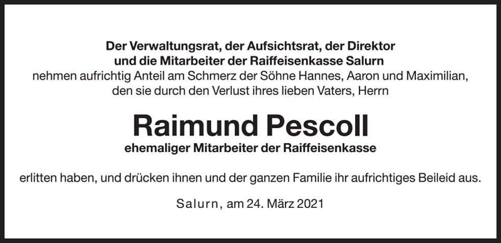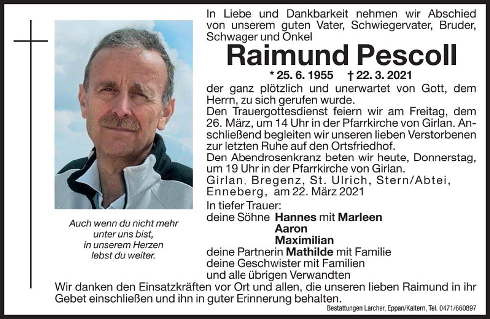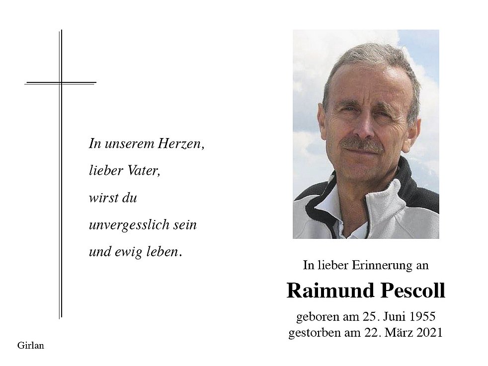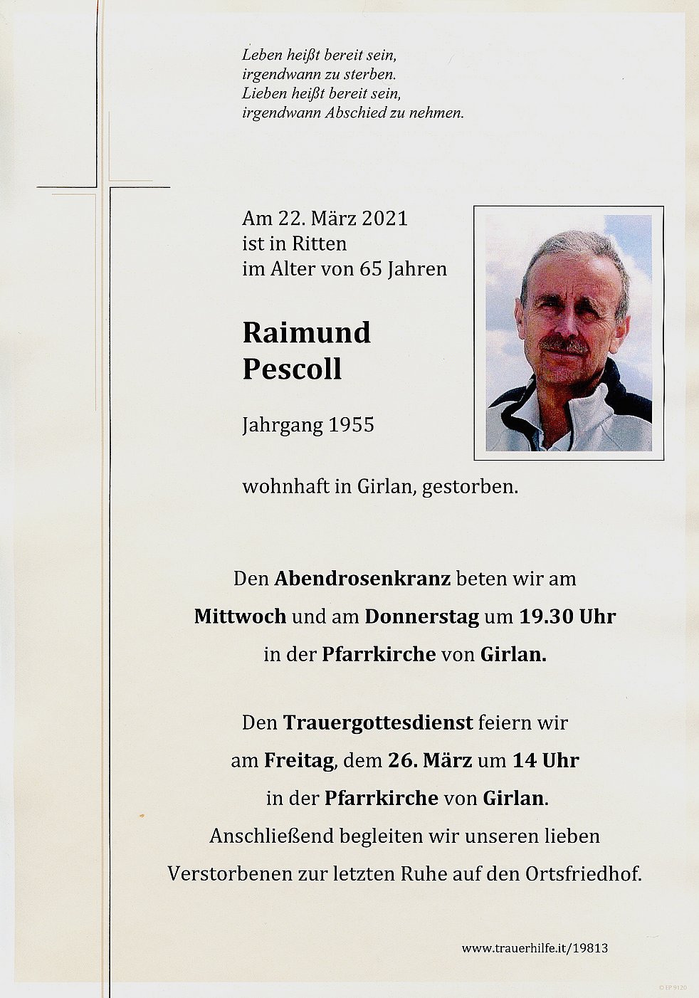 Den Trauergottesdienst feiern wir am Freitag, dem 26. März um 14 Uhr in der Pfarrkirche von Girlan.
