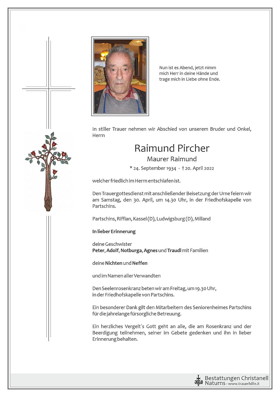 Den Trauergottesdienst mit anschließender Beisetzung der Urne feiern wir am Samstag, den 30. April, um 14.30 Uhr, in der Friedhofskapelle von Partschins.