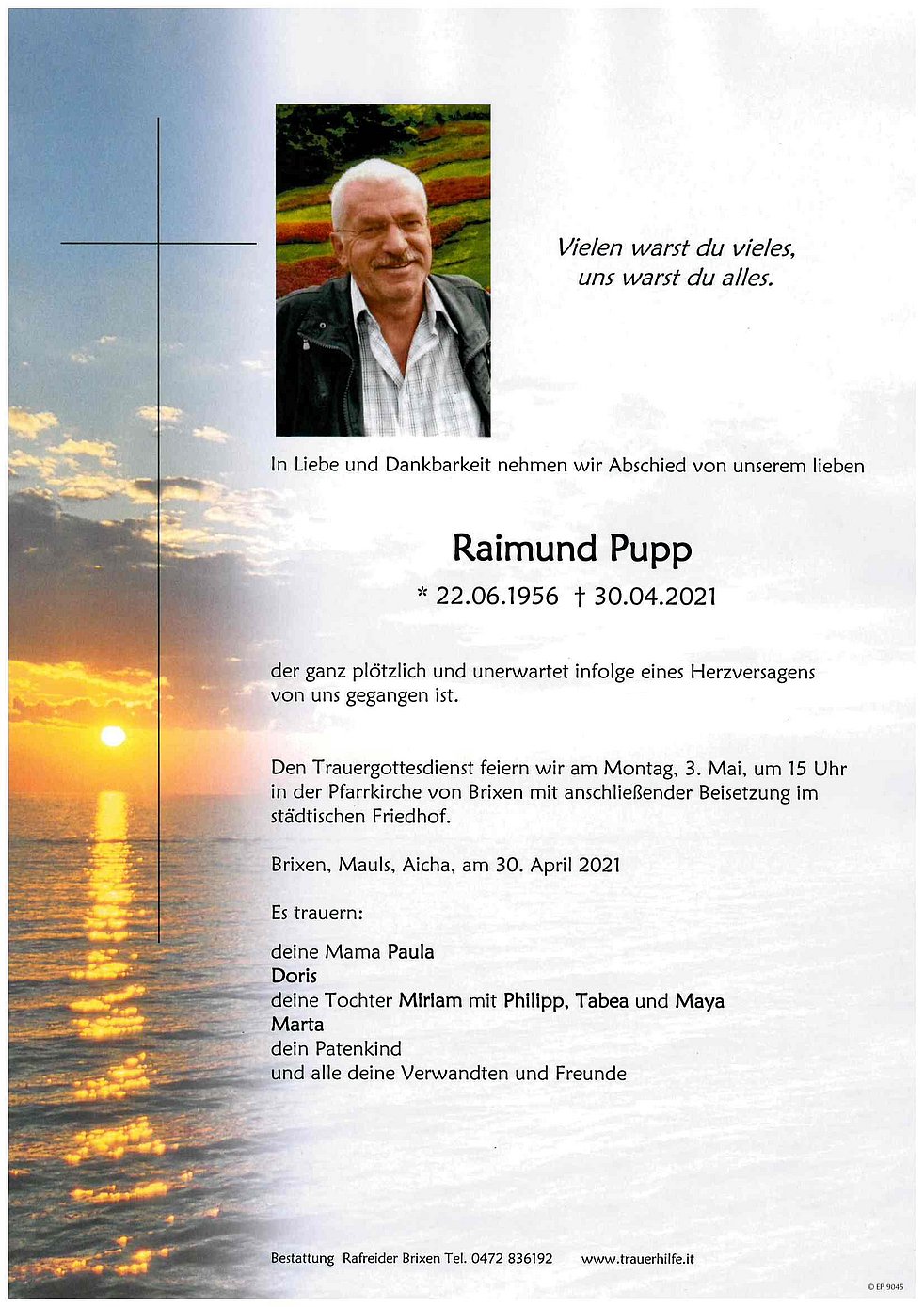 Den Trauergottesdienst feiern wir am Montag, 3. Mai, um 15 Uhr in der Pfarrkirche von Brixen mit anschließender Beisetzung im städtischen Friedhof.