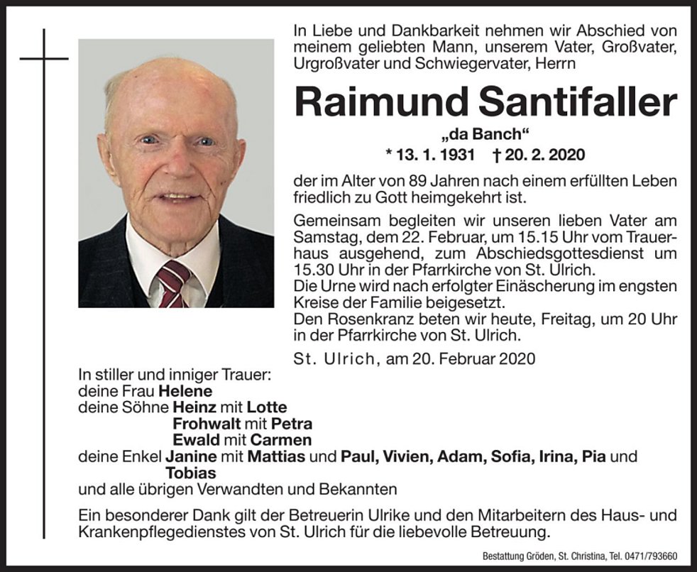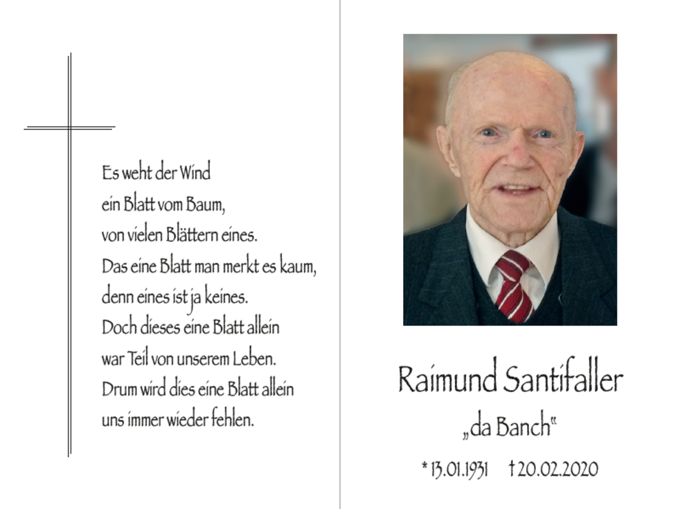 Gemeinsam begleiten wir unseren lieben Vater am Samstag, dem 22. Februar, um 15.15 Uhr vom Trauerhaus ausgehend zum Abschiedsgottesdienst um 15.30 Uhr in der Pfarrkirche von St. Ulrich.