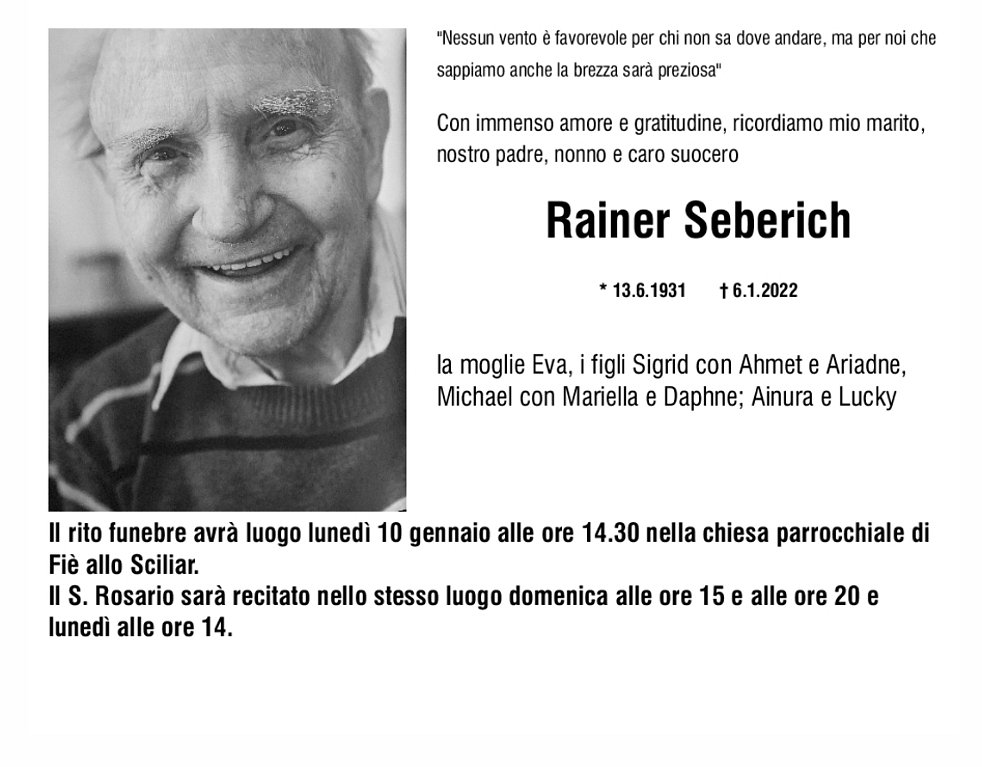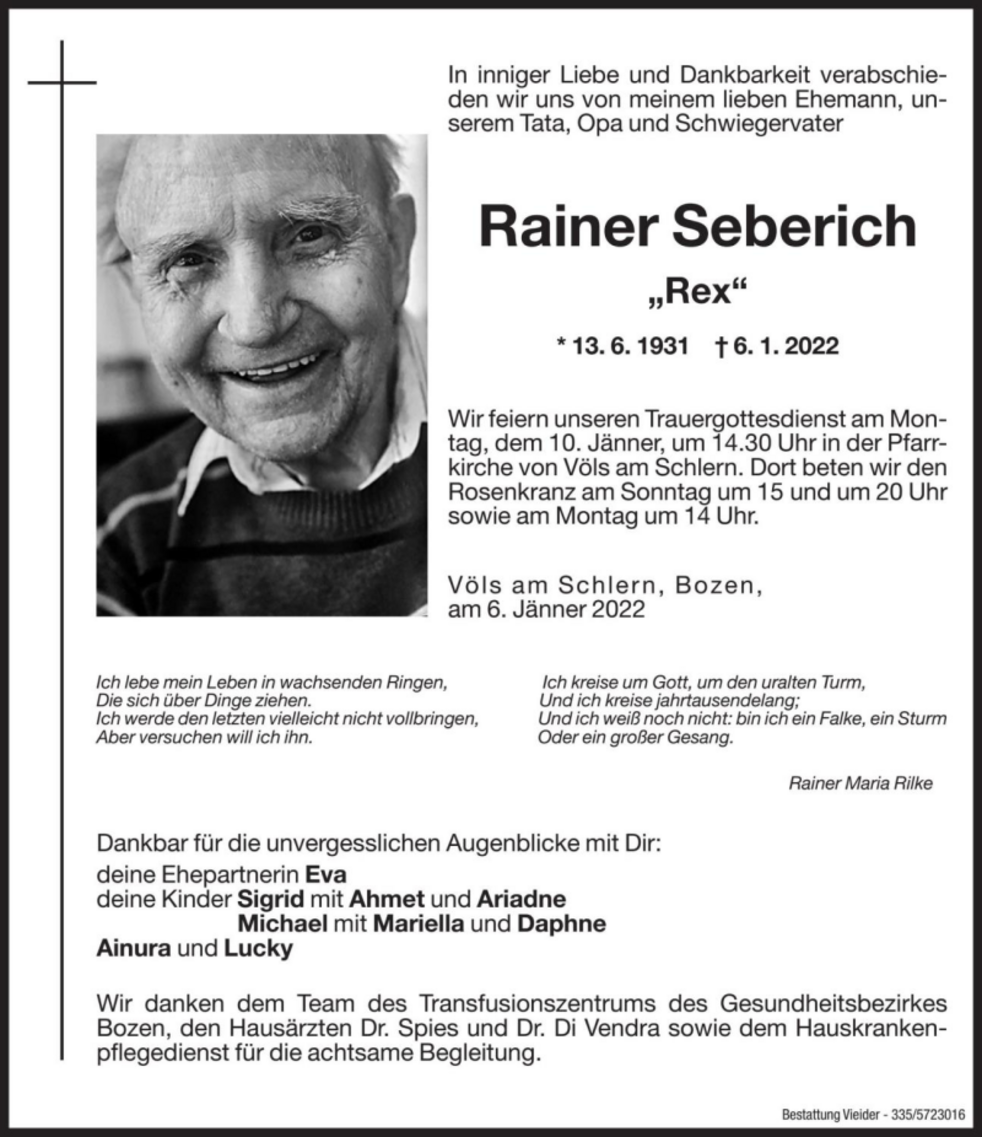 Wir feiern unseren Trauergottesdienst am Montag, dem 10. Jänner, um 14.30 Uhr in der Pfarrkirche von Völs am Schlern. Dort beten wir den Rosenkranz am Sonntag um 15 und um 20 Uhr, sowie am Montag um 14 Uhr.