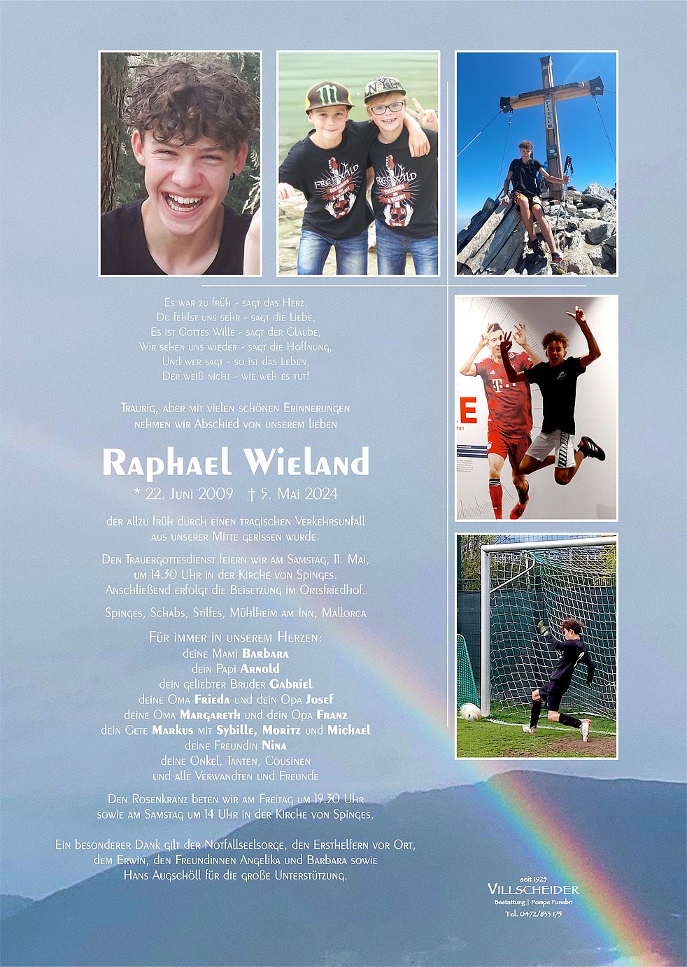 Enkr Raphael isch in dr blüte va sein lebn zu an engl gwortn. I wünsch enk gonz viel kroft und die nötige stütze die Trauer zu (er)trogn, enkr Raphael wert ollm af enk orschaugn und als hellstr stern leichtn. Aufrichtiges Beileid dr gonzn Familie .