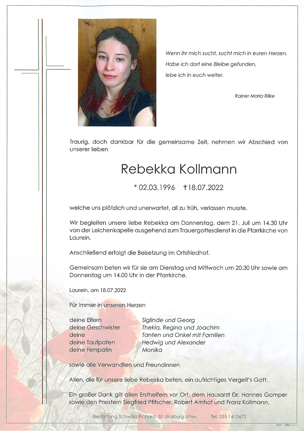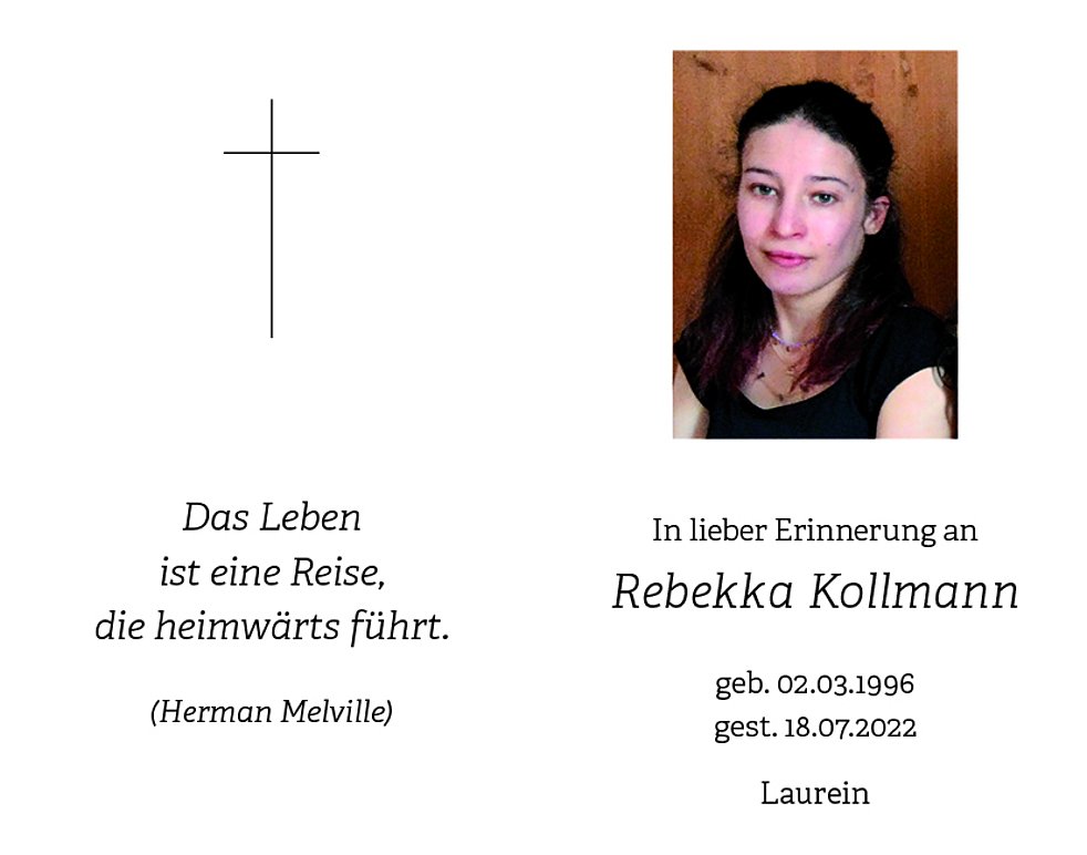 Wir begleiten unsere liebe Rebekka am Donnerstag, dem 21. Juli um 14.30 Uhr von der Leichenkapelle ausgehend zum Trauergottesdienst in die Pfarrkirche von Laurein.