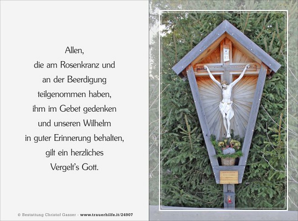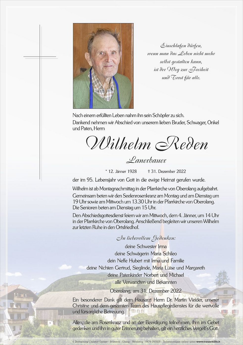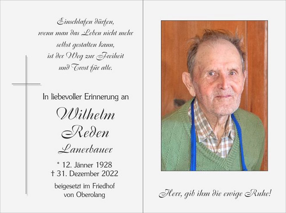 Den Abschiedsgottesdienst feiern wir am Mittwoch, dem 4. Jänner, um 14 Uhr in der Pfarrkirche von Oberolang. Anschließend begleiten wir unseren Wilhelm zur letzten Ruhe in den Ortsfriedhof.