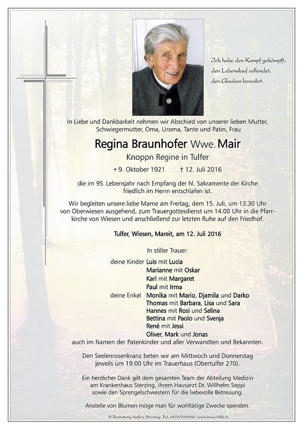 Wir begleiten unsere liebe Mame am Freitag, dem 15. Juli, um 13.30 Uhr von Oberwiesen ausgehend, zum Trauergottesdienst um 14.00 Uhr in die Pfarrkirche von Wiesen und anschließend zur letzten Ruhe auf den Friedhof.
