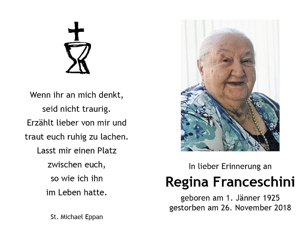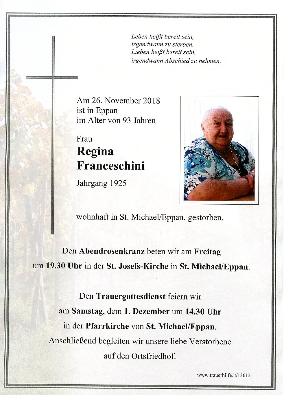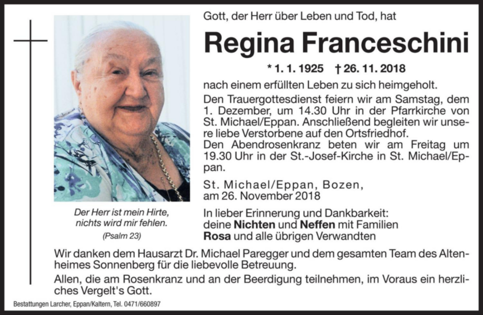 Den Trauergottesdienst feiern wir am Samstag, dem 1. Dezember um 14.30 Uhr in der Pfarrkirche von St. Michael/Eppan. Anschließend begleiten wir unsere liebe Verstorbene auf den Ortsfriedhof.