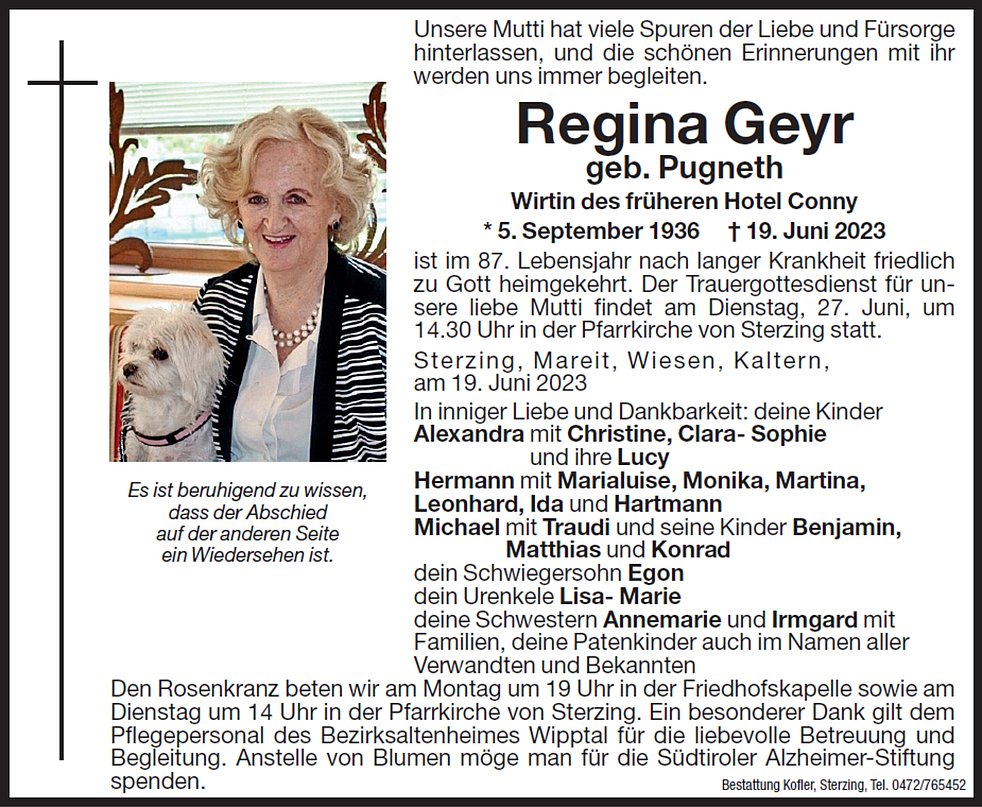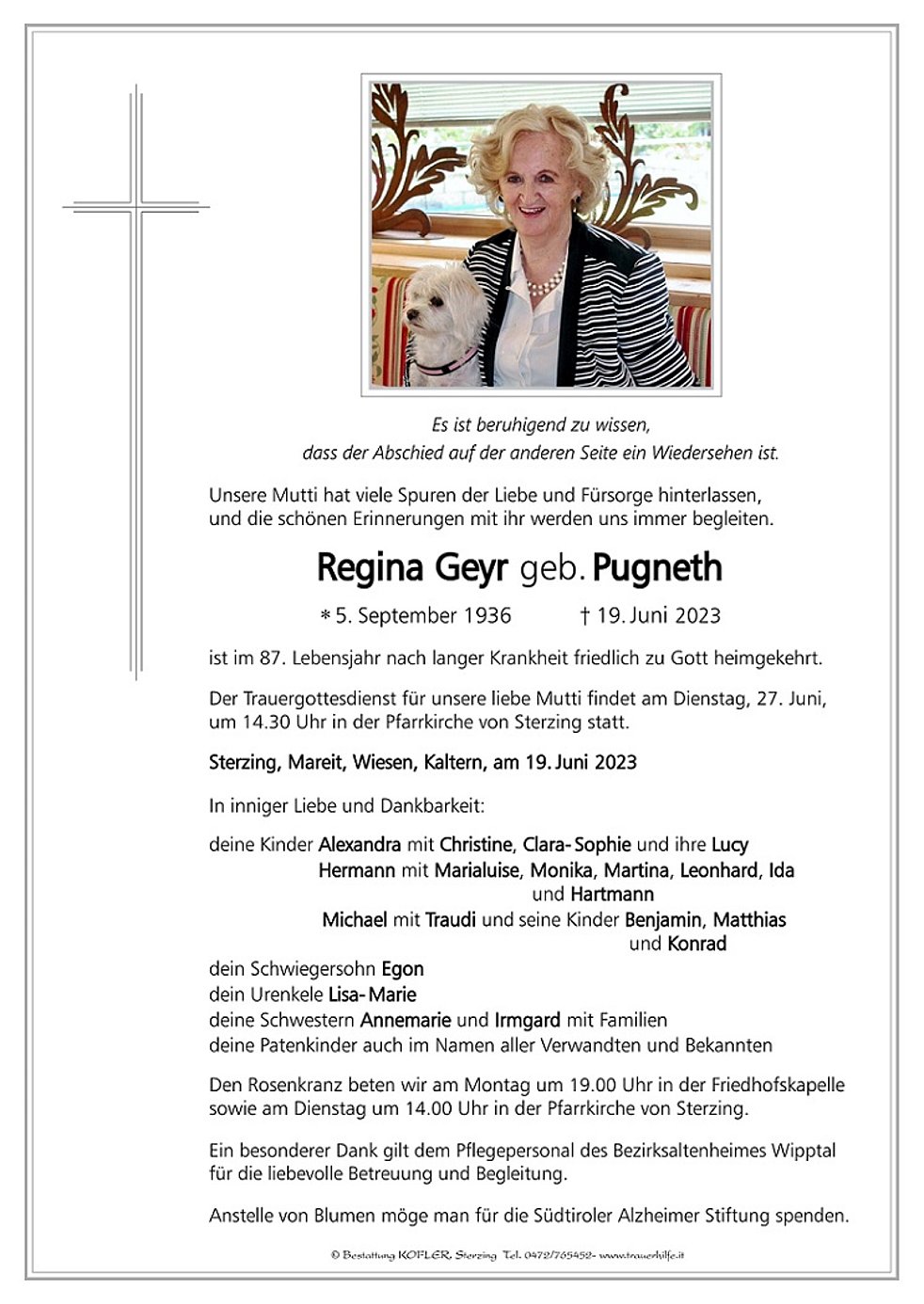 Der Trauergottesdienst für unsere liebe Mutti findet am Dienstag, 27. Juni, um 14.30 Uhr in der Pfarrkirche von Sterzing statt.