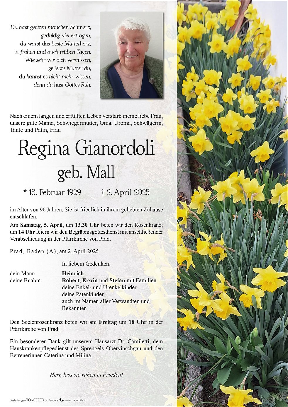 Begräbnisgottesdienst: 05.04. - 14:00 Uhr Pfarrkirche von Prad