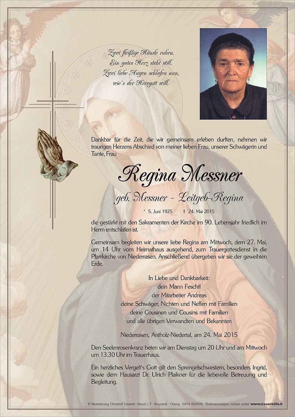 Gemeinsam begleiten wir unsere liebe Regina am Mittwoch, dem 27. Mai, um 14 Uhr vom Heimathaus ausgehend, zum Trauergottesdienst in die Pfarrkirche von Niederrasen. Anschließend übergeben wir sie der geweihten Erde.