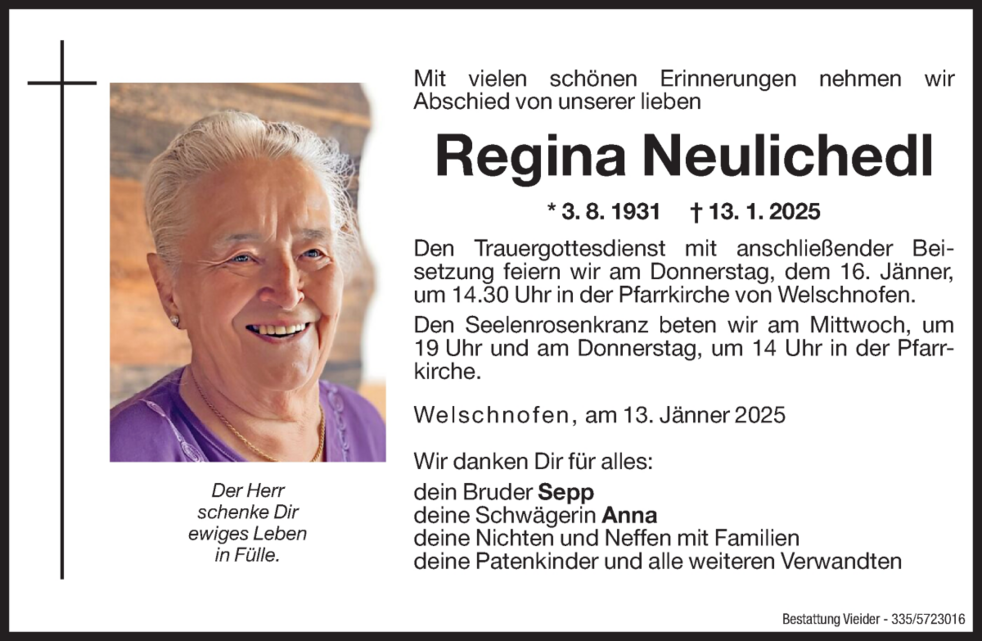 Den Trauergottesdienst mit anschließender Beisetzung feiern wir am Donnerstag, 16. Jänner, um 14.30 Uhr in der Pfarrkirche von Welschnofen.