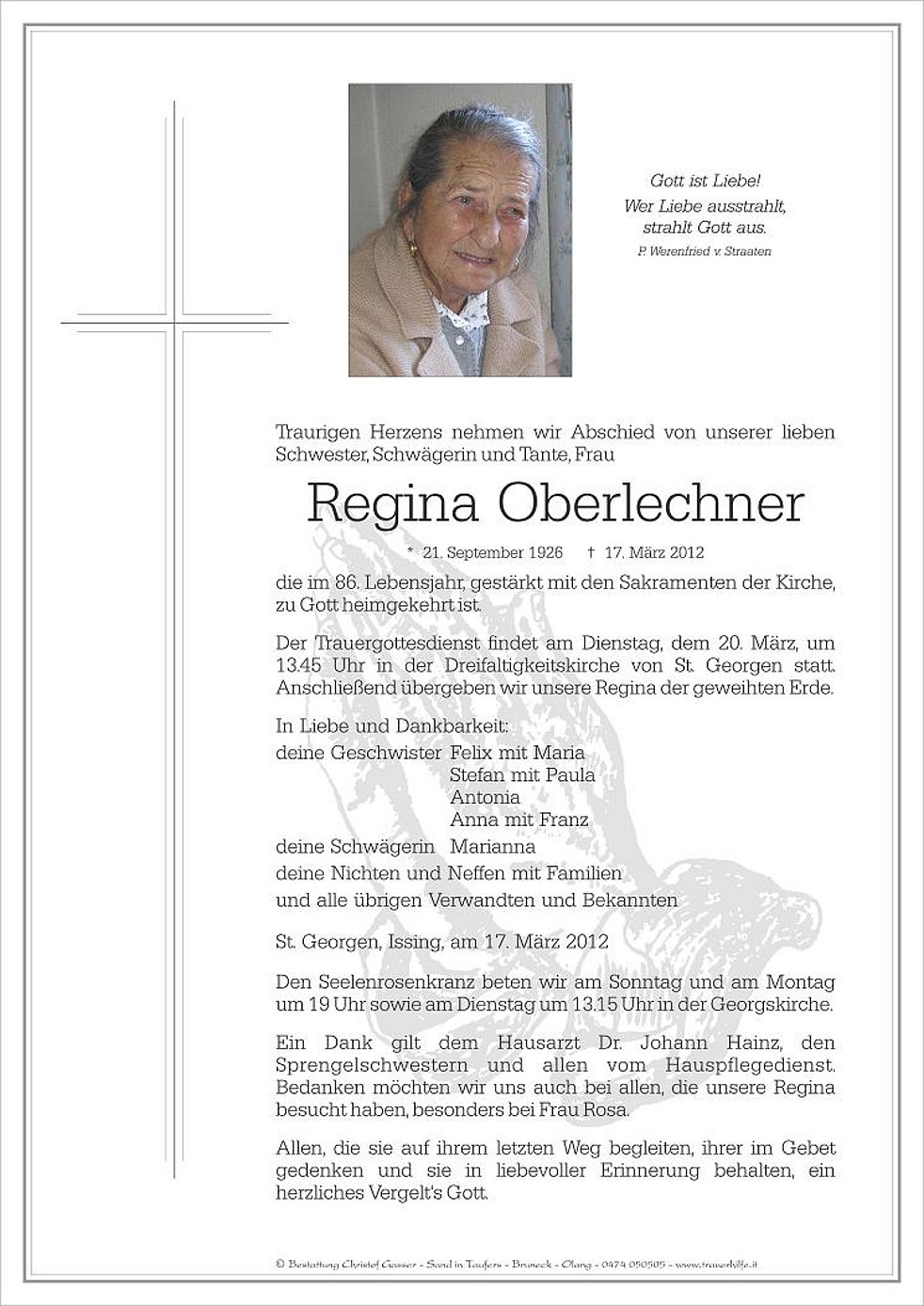 Der Trauergottesdienst findet am Dienstag, dem 20. März, um 13.45 Uhr in der Dreifaltigkeitskirche von St. Georgen statt. Anschließend übergeben wir unsere Regina der geweihten Erde.