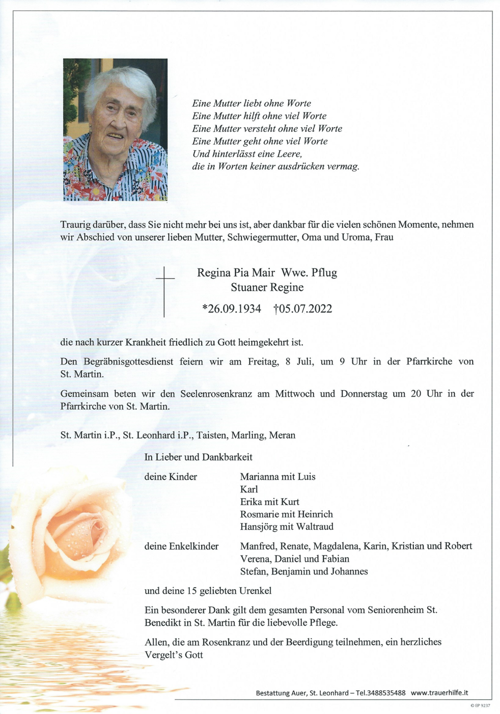 Ein besonderer Dank gilt dem gesamten Personal vom Seniorenheim St. Benedikt in St. Martin für die liebevolle Pflege.
