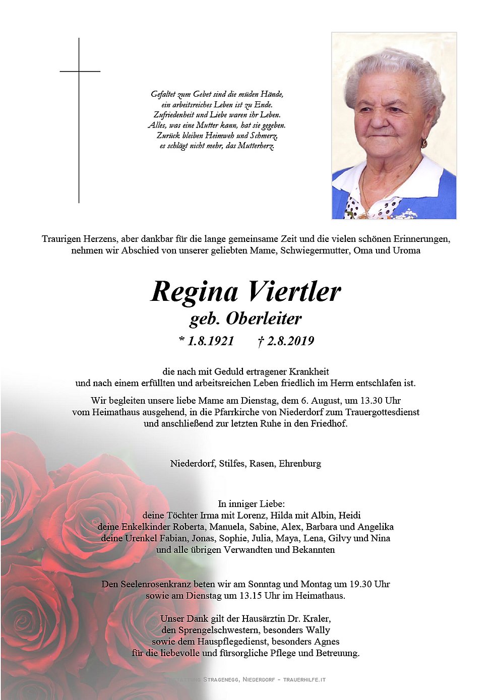 Wir begleiten unsere liebe Mame am Dienstag, dem 6. August, um 13.30 Uhr vom Heimathaus ausgehend, in die Pfarrkirche von Niederdorf zum Trauergottesdienst und anschließend zur letzten Ruhe in den Friedhof.
