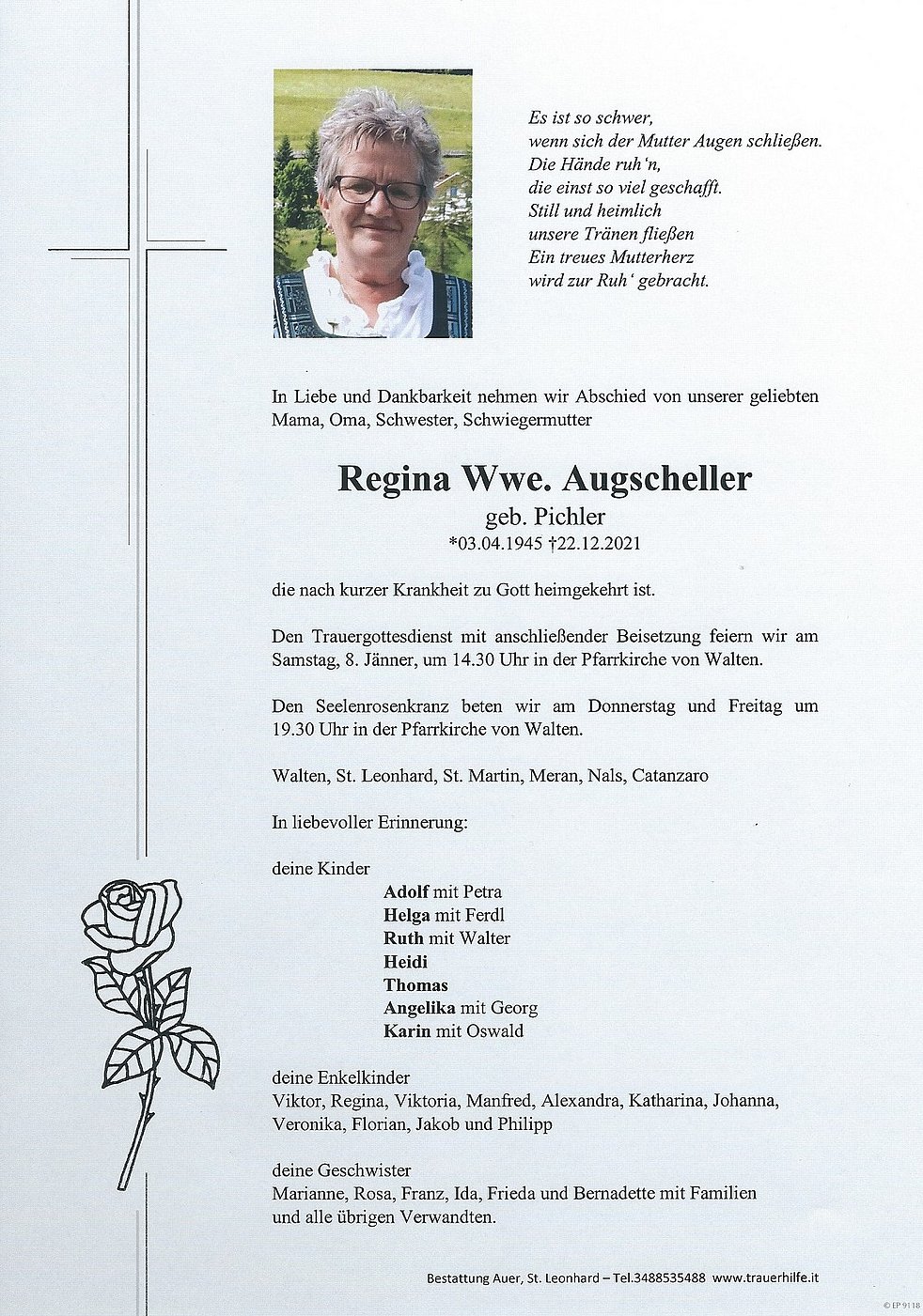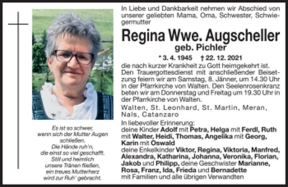 Den Trauergottesdienst mit anschließender Beisetzung feiern wir am Samstag, 8. Jänner, um 14.30 Uhr in der Pfarrkirche von Walten.