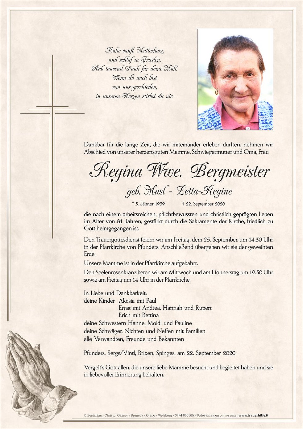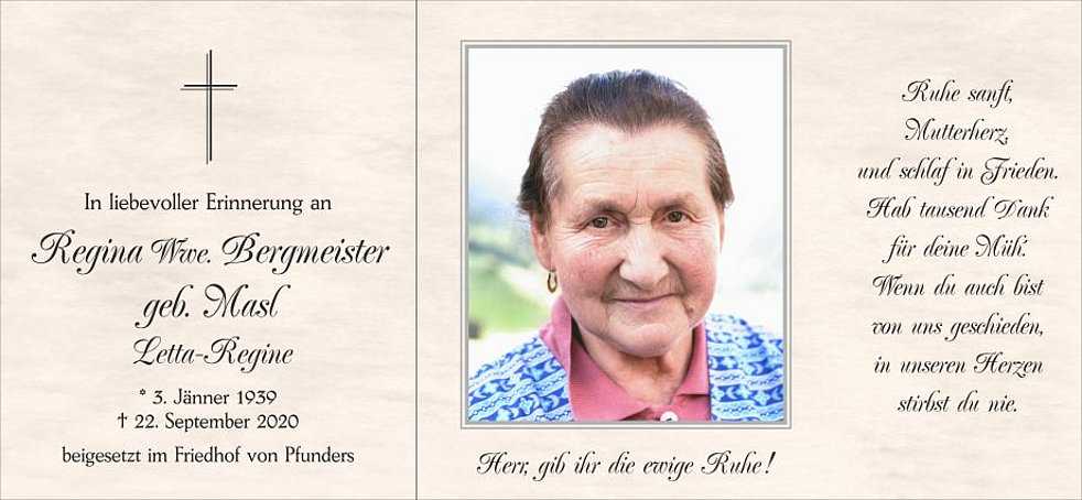 Den Trauergottesdienst feiern wir am Freitag, dem 25. September, um 14.30 Uhr in der Pfarrkirche von Pfunders. Anschließend übergeben wir sie der geweihten Erde.