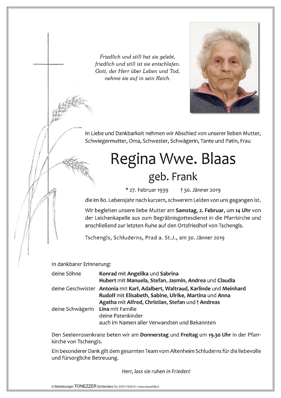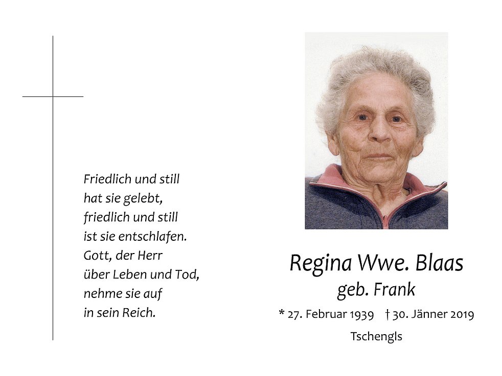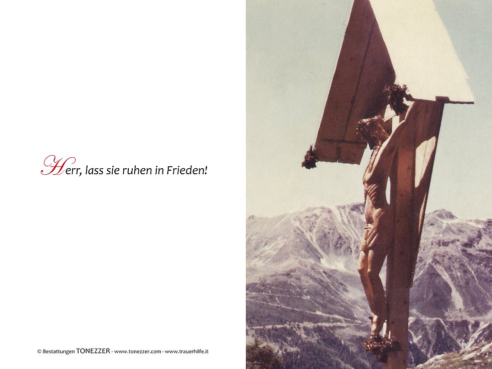 Wir begleiten unsere liebe Mutter am Samstag, 2. Februar, um 14 Uhr von der Leichenkapelle aus zum Begräbnisgottesdienst in die Pfarrkirche und anschließend zur letzten Ruhe auf den Ortsfriedhof von Tschengls.