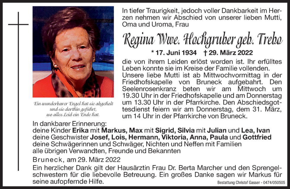 Ein herzlicher Dank gilt der Hausärztin Frau Dr. Berta Marcher und den Sprengelschwestern für die liebevolle Betreuung. Ein großes Danke sagen wir Markus für seine aufopfernde Hilfe.