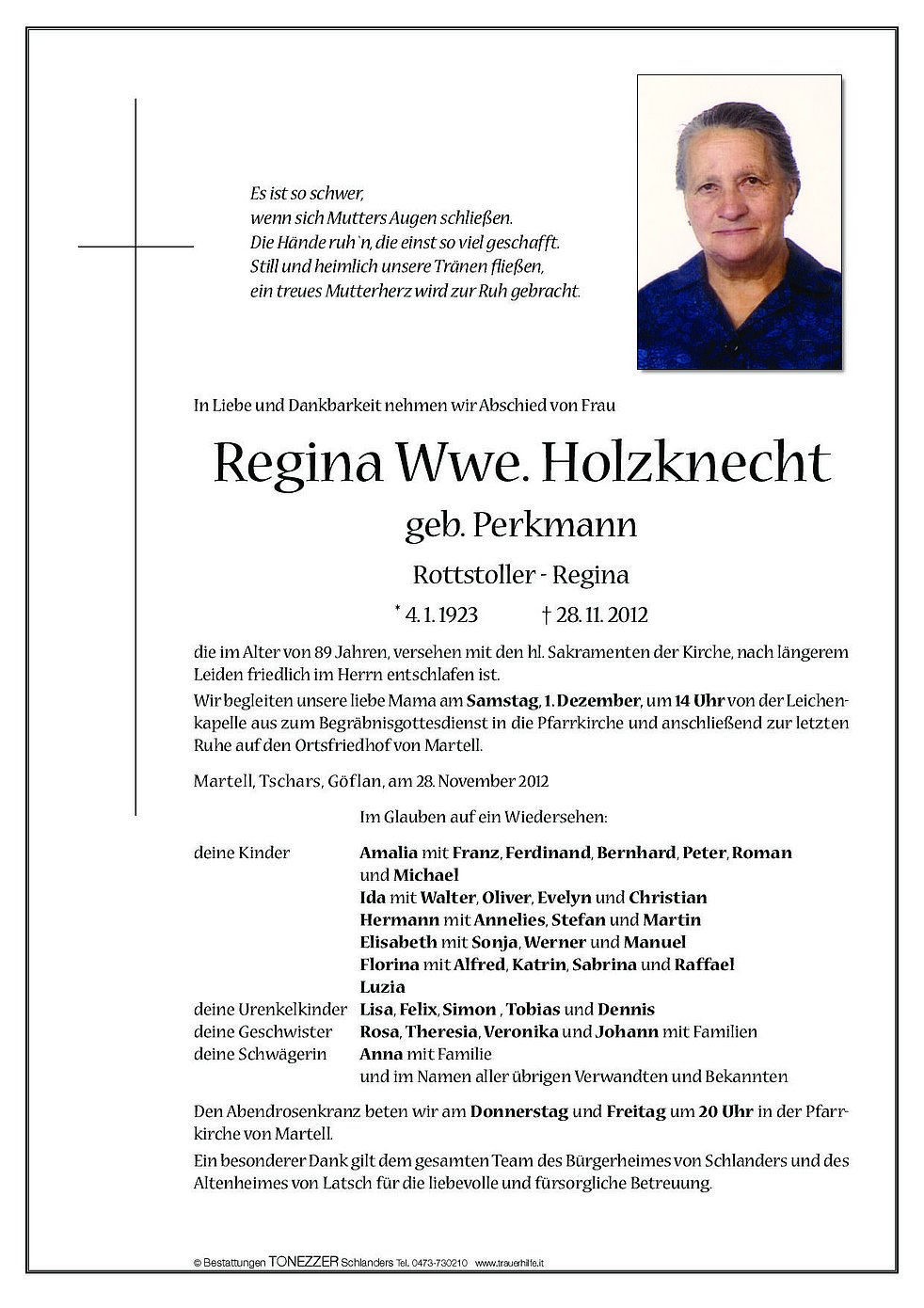 Wir begleiten unsere liebe Mama am Samstag, 1. Dezember, um 14 Uhr von der Leichenkapelle aus zum Begräbnisgottesdienst in die Pfarrkirche und anschließend zur letzten Ruhe auf den Ortsfriedhof von Martell.