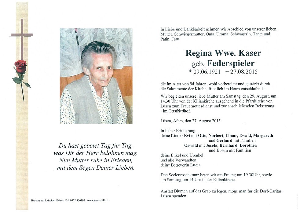 Wir begleiten unsere liebe Mutter am Samstag, den 29. August, um 14.30 Uhr von der Kiliankirche ausgehend in die Pfarrkirche von Lüsen zum Trauergottesdienst und zur anschließenden Beisetzung im Ortsfriedhof.