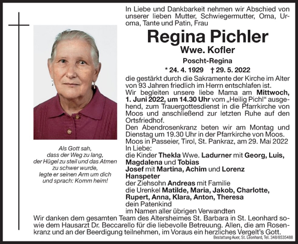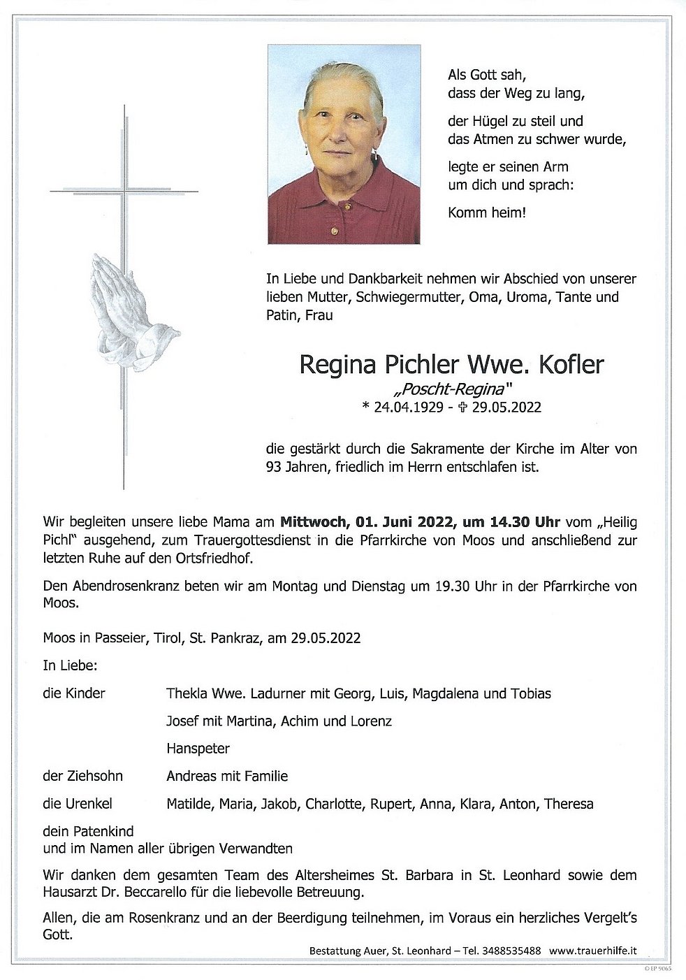 Wir begleiten unsere liebe Mama am Mittwoch, 01. Juni 2022, um 14.30 Uhr vom „Heilig Pichl“ ausgehend, zum Trauergottesdienst in die Pfarrkirche von Moos und anschließend zur letzten Ruhe auf den Ortsfriedhof.