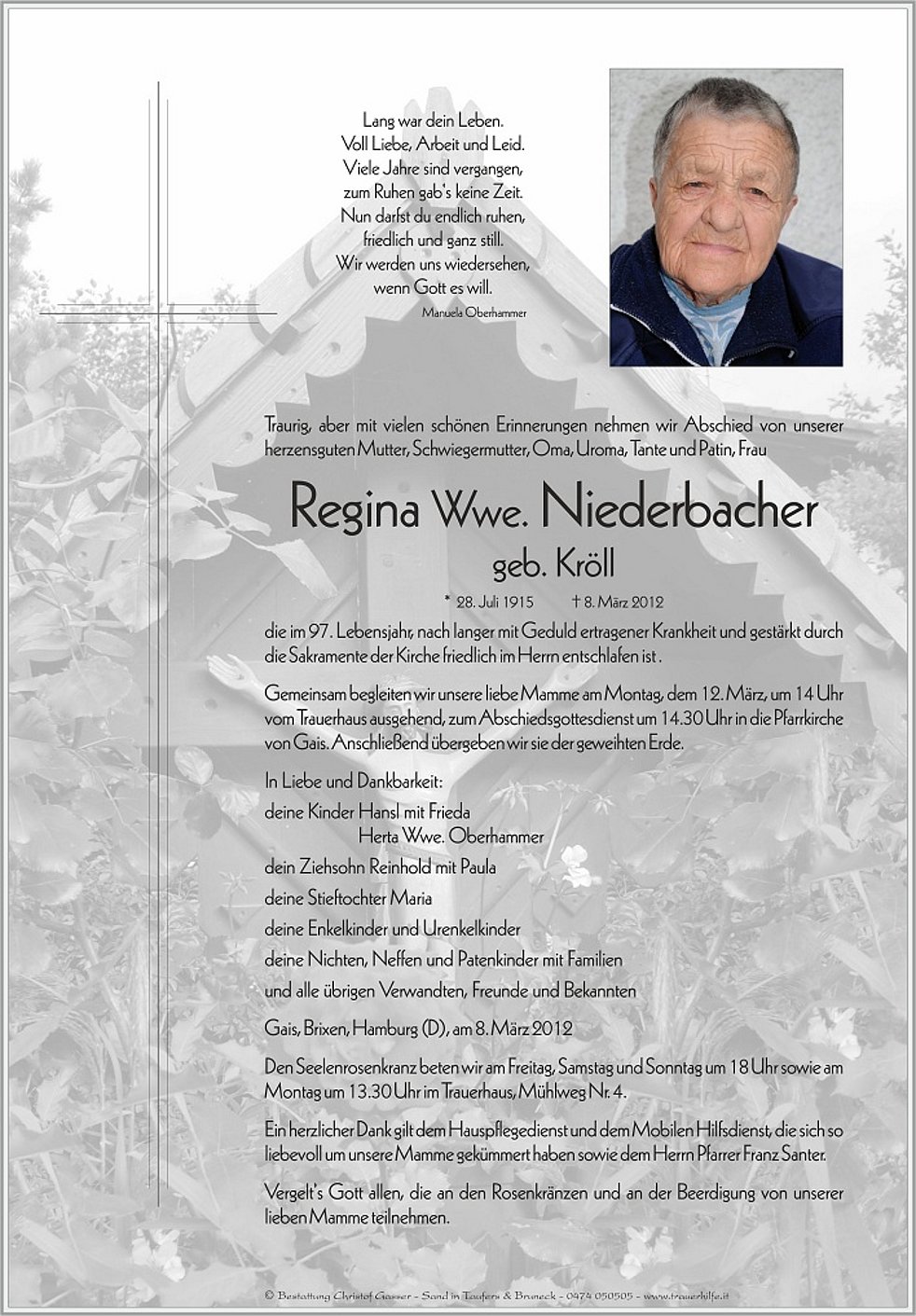 Gemeinsam begleiten wir unsere liebe Mamme am Montag, dem 12. März, um 14 Uhr vom Trauerhaus ausgehend, zum Abschiedsgottesdienst um 14.30 Uhr in die Pfarrkirche von Gais. Anschließend übergeben wir sie der geweihten Erde.