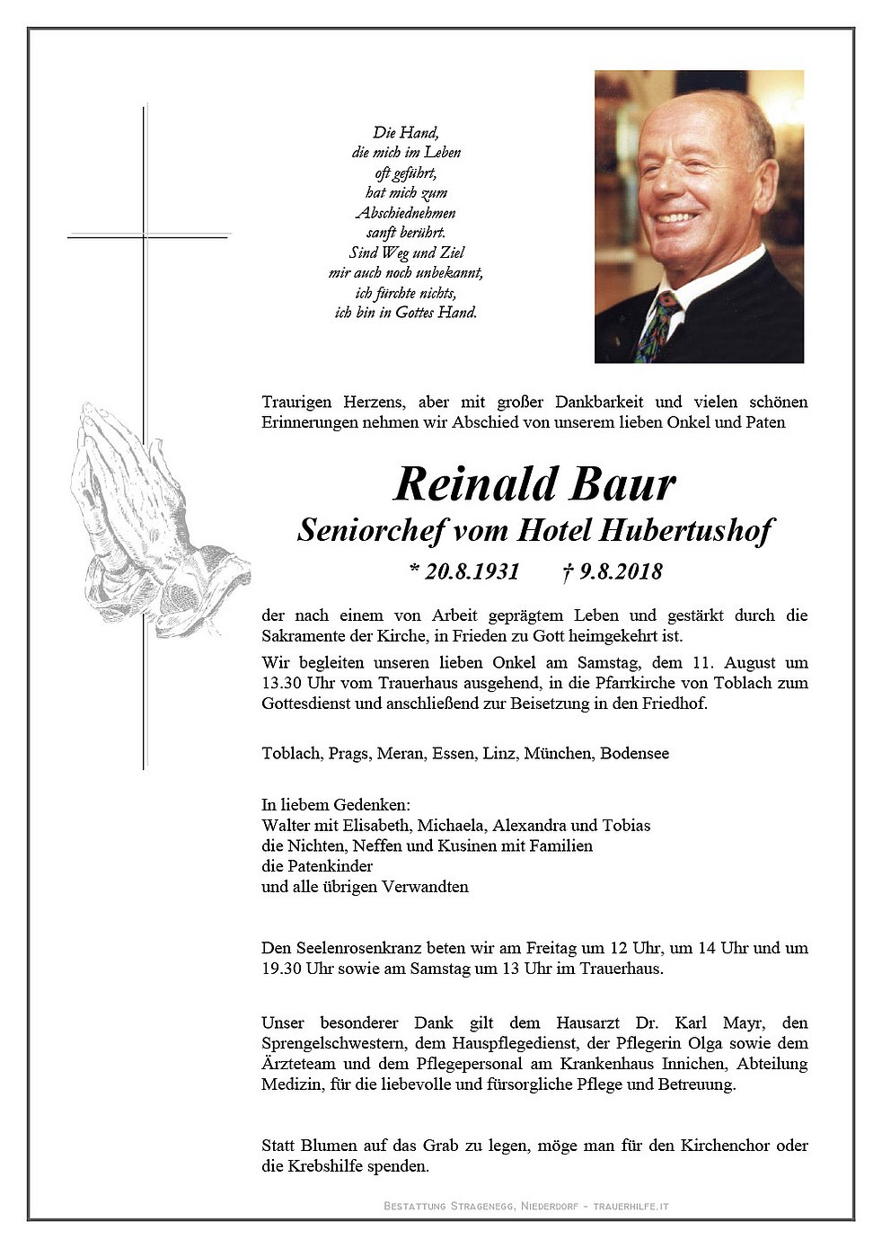 Wir begleiten unseren lieben Onkel am Samstag, dem 11. August um 13.30 Uhr vom Trauerhaus ausgehend, in die Pfarrkirche von Toblach zum Gottesdienst und anschließend zur Beisetzung in den Friedhof.