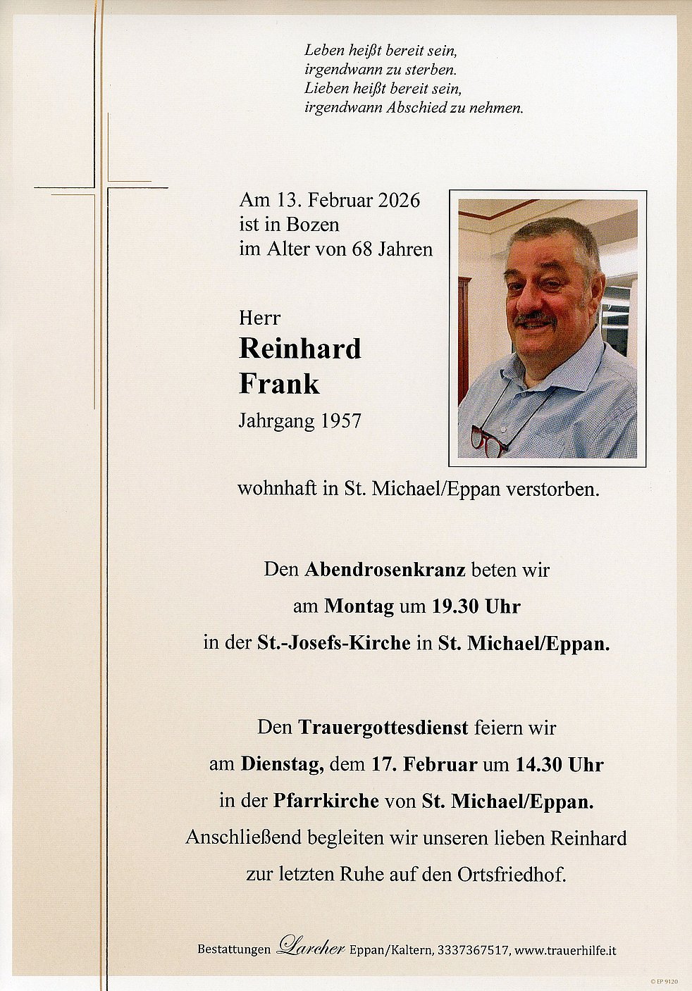 Den Trauergottesdienst feiern wir am Dienstag, dem 17. Februar, um 14.30 Uhr in der Pfarrkirche von St. Michael/Eppan. Anschließend begleiten wir unseren lieben Verstorbenen zur letzten Ruhe auf den Ortsfriedhof.