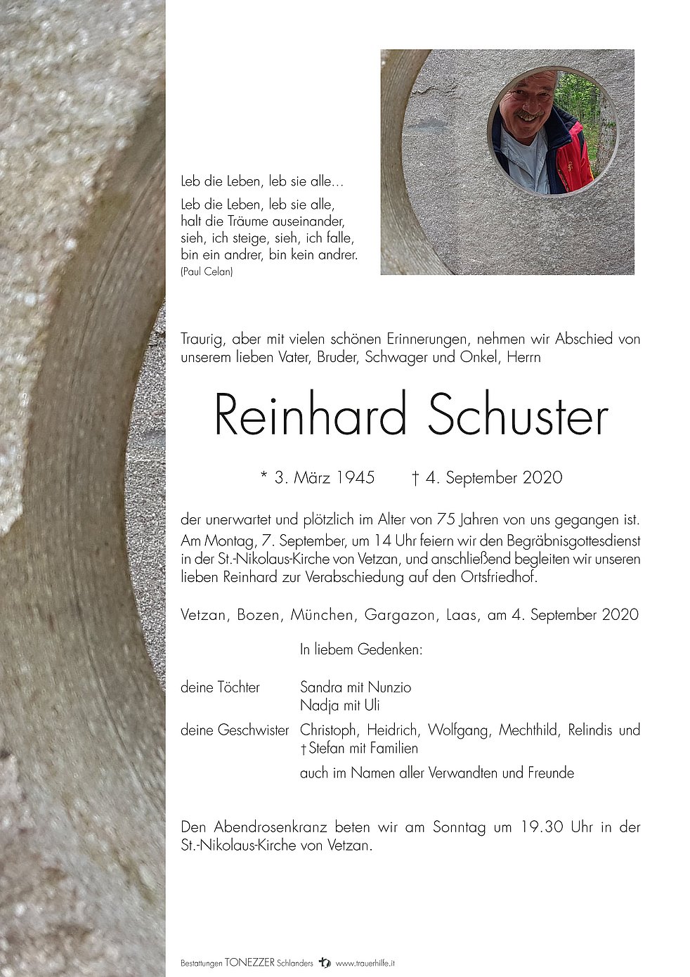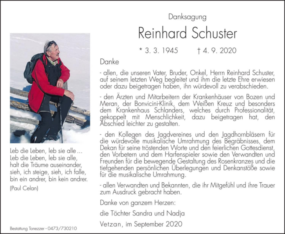 Am Montag, 7. September, um 14 Uhr feiern wir den Begräbnisgottesdienst in der St.-Nikolaus-Kirche von Vetzan, und anschließend begleiten wir unseren lieben Reinhard zur Verabschiedung auf den Ortsfriedhof.