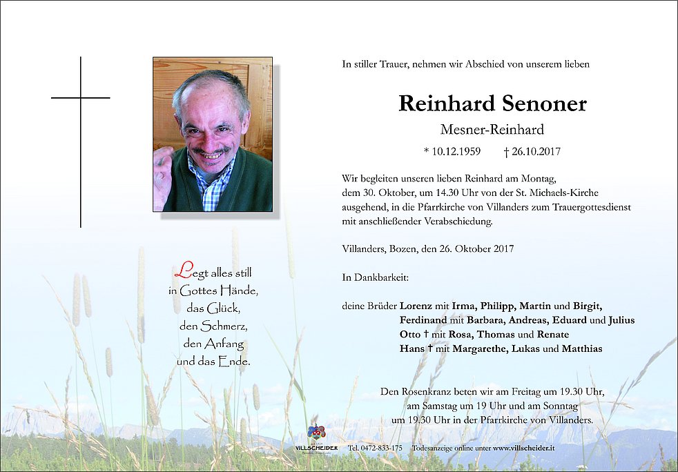 dem 30. Oktober, um 14.30 Uhr von der St. Michaels-Kirche ausgehend, in die Pfarrkirche von Villanders zum Trauergottesdienst mit anschließender Verabschiedung.