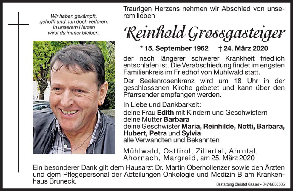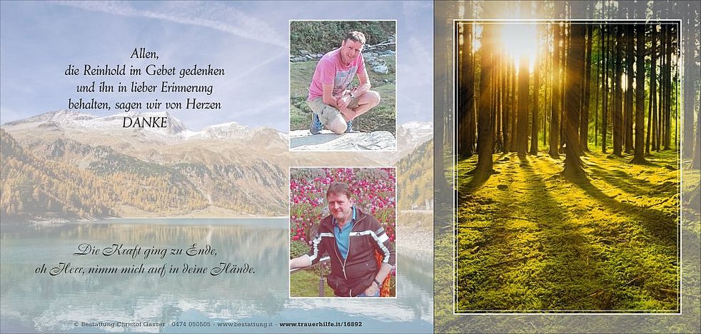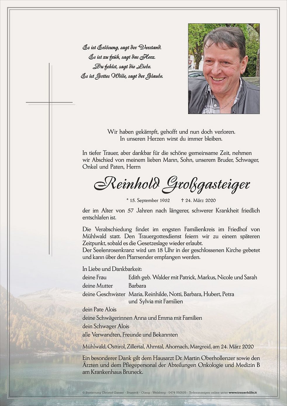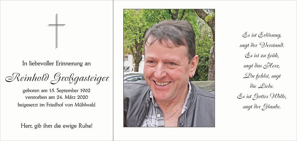 Die Verabschiedung findet im engsten Familienkreis im Friedhof von Mühlwald statt. Den Trauergottesdienst feiern wir zu einem späteren Zeitpunkt, sobald es die Gesetzeslage wieder erlaubt.
